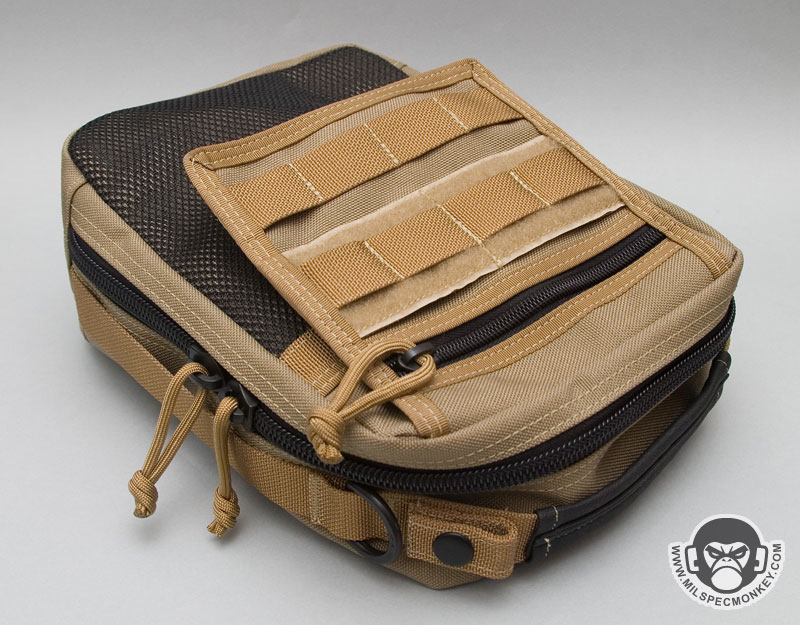 On the front side is a flap with a thin zippered pocket and a PALS matrix of 4 channels and 2 rows. The extra loop velcro under the PALS is to interface with Maxpedition sheath products. When the flap is lifted up the big frontal mesh sleeve pocket is accessible. The flap connects to the mesh sleeve with velcro and the mesh sleeve is held down to the pouch with a inner velcro flap. I was a little confused about the inner velcro flap at first, but I can see where it allows for closure while more goods are in the mesh pocket. I'll note here that the mesh pocket is big and useful, but having the PALS flap be held down by a small velcro area is a little unsecure. The pouch won't be harmed by use, but the flap will likely be "floppy" if other pouches are attached the the PALS flap and used during heavy movement. If you only plan to wear the pouch at a walking pace, then don't worry about it.