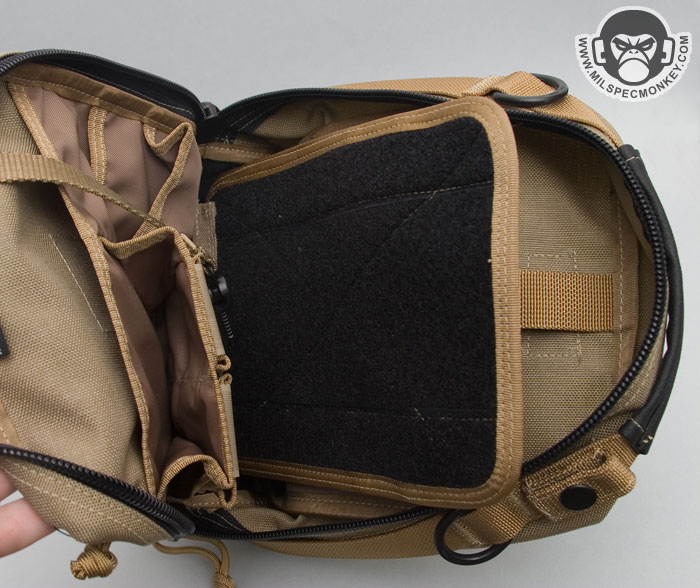 After opening up the main double zippers we get to the pocket fiesta of the inside. The Neatfreak zippers go down pretty far, but not enough to call it clamshell style. The back interior consists of: a large expandable depth sleeve pocket with velcro webbing strap, a medium sized thin sleeve, and 2 tall pockets about flashlight sized. The main large back sleeve with the strap can hold a lot more than it looks.The interior back side has a similar, yet still unique layout of: a plastic lanyard clip on thin webbing, large back sleeve, medium sleeve with a little expansion, 2 tall flashlight sized pockets with velcro flaps which also have half tall pockets attached to the bottom area of each, and an extra shorter pocket with some expansion on the side. The velcro flaps can be used to cover both the tall and short flashlight sized pockets, or just the tall ones. The flaps are kinda meh, since they are just raw velcro. I would have liked them more as webbing with velcro sewn on. As is, they will still secure objects inside. In the middle of the inside is the cool modular and removable divider velcro panel. One side is all loop velcro for modular attachments / pouches while the other side is 1 medium sleeve and 2 half-size sleeves good for small papers or pens. Depending how one uses the panel, they can go for more EDC carrying capacity or spice it up with a modular holster for some CCW action.