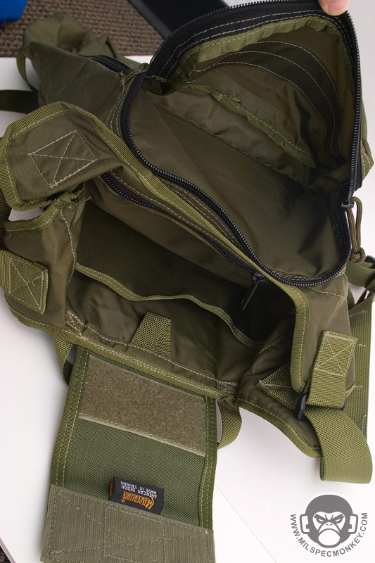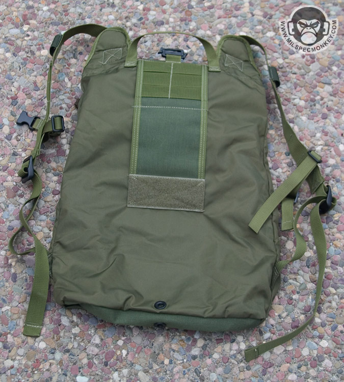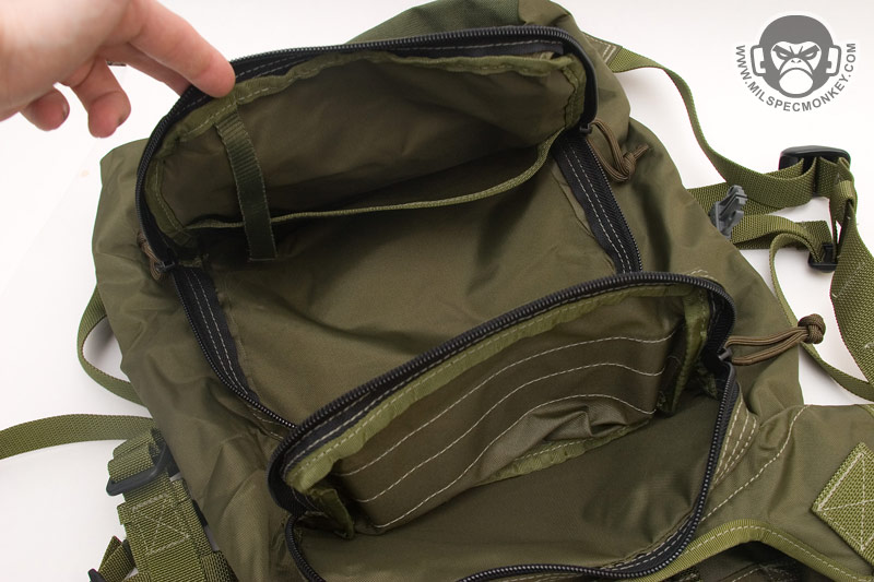 Like the normal the backpack version, most of the pack is made of 420 D material while the base (PALS area) is 1000 D. As usual the main flap uses a velcro closure and the back has PALS for 2 short malice clips with a sleeve for belt mounting. A siamese clip is on top for extra mounting options. A simple carrying handle has been added that is accessible when packed or deployed. The backpack straps now include a sternum strap and are connected to the pouch in a manner to allow expansion when filled. The other big addon is the smaller external pockets. Once expanded into a backpack, there is a lower square-ish zippered pocket and a higher rectangle zippered pocket. The lower one actually has another thin zippered pocket on it and a loop velcro area. The larger part of the lower pocket has a divder sleeve close to the front and a plastic lanyard. The higher rectangle pocket doesn't have anything special inside, but has loop velcro on the exterior which is what the main flap attaches to. Speaking of the main flap, a loop velcro area was added so one can easily get the flap out of the way when putting items in and out of the pack. I hope someday this feature is added to all Rollypolys. Moving to the interior, there is a webbing loop up top for hanging items such as hydration bladders and a built in hydration sleeve to hold up to a 100 oz bladder. On the other side of the interior is a slim zippered pocket. When totally filled up the whole pack holds about 500 cu.