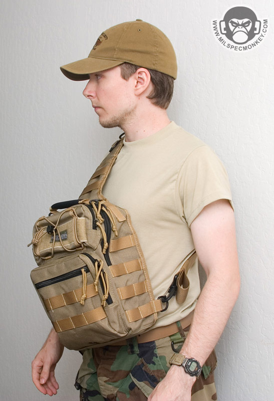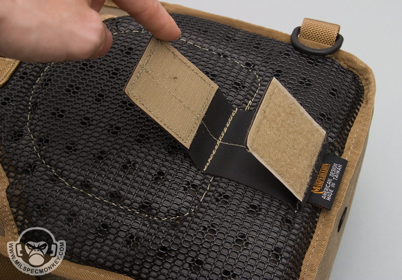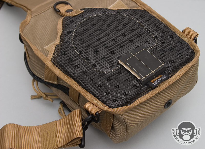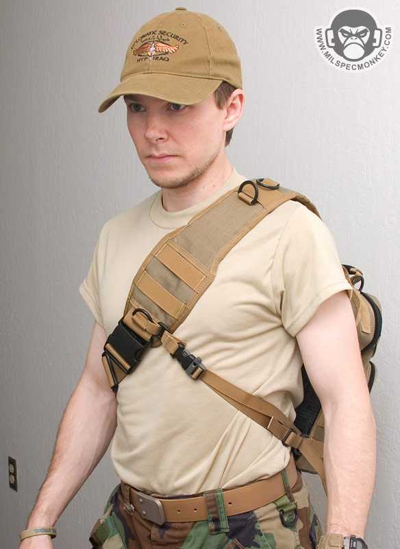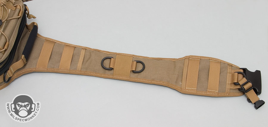 The longer shoulder strap is nice and padded giving a good ride even with heavier loads. Since there is more length, more PALS-like loops have been added, but they are not sewn down the middle. 2 D-rings are in the middle for attachment points and another is at the end close to the main SRB. This D-ring is the attachment point for the new cross-strap which then connects to one of the lower side D-rings of the Lunada. Those on bikes or doing general fast movement will highly appreciate the cross-strap since it prevents placement shifting. A small draw back to the long shoulder strap is that it does not tuck into the back CCW pocket very well since it causes a large bulge.