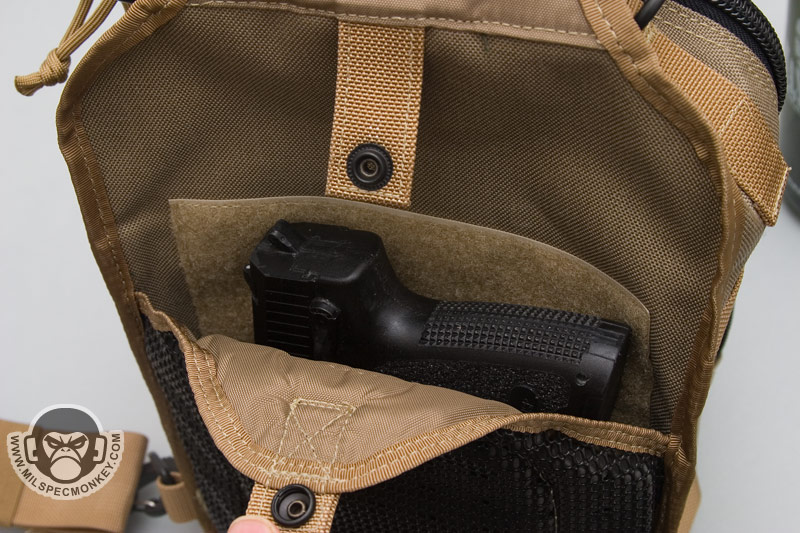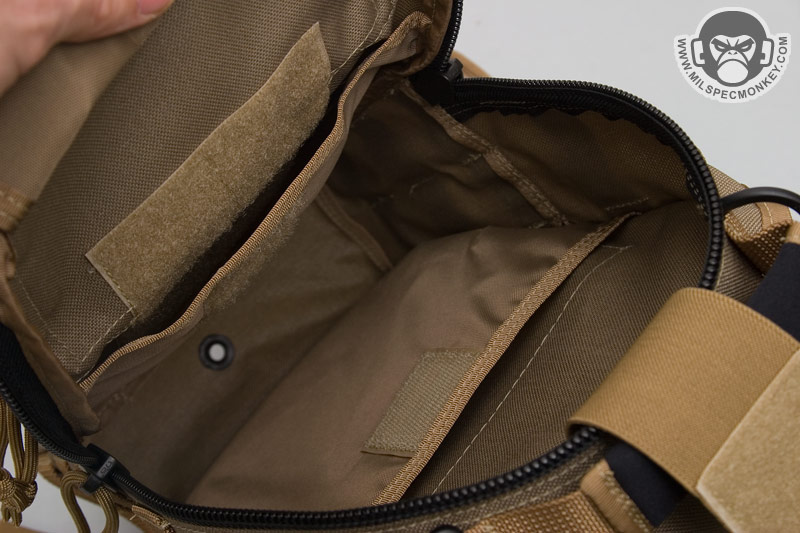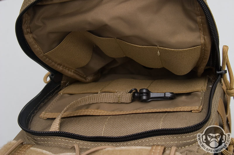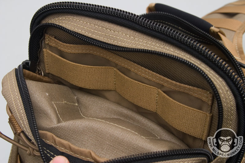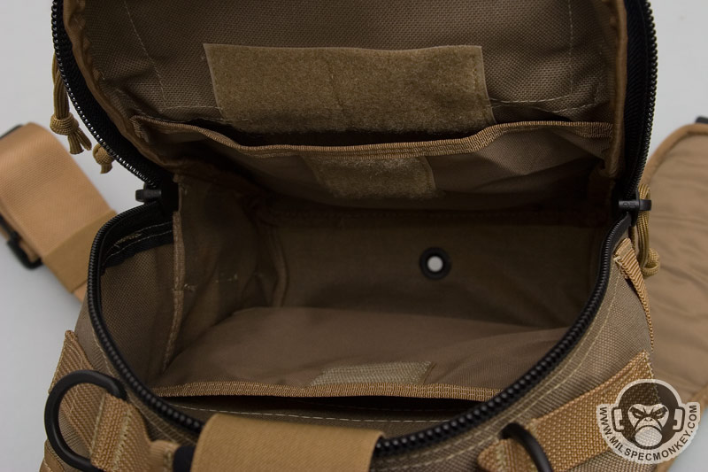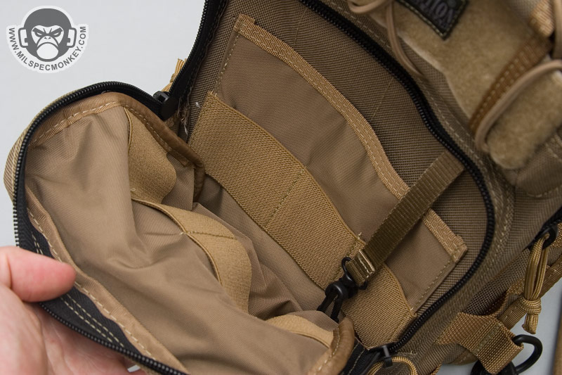 The inside of the main compartment is very similar, but a flap to the inner front has been added that doubles as a slim zipper pocket. I'm not so sure about this flap since it covers this CCW area that was nice and open on the Remora. To get the flap out of the way, one can tuck it into the sleeve pocket that it serves as a flap for. A draw back to this is that the loop velcro inside this sleeve pocket area is then covered up. Thus if you have a holster or something in there, the flap still covers your item. If you find yourself fighting this flap, just cut it off and call it a day.