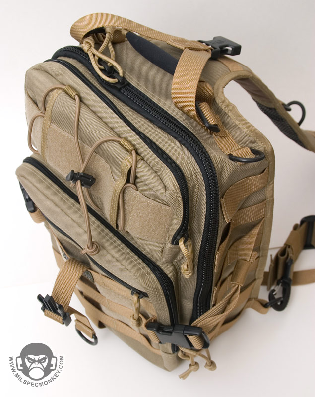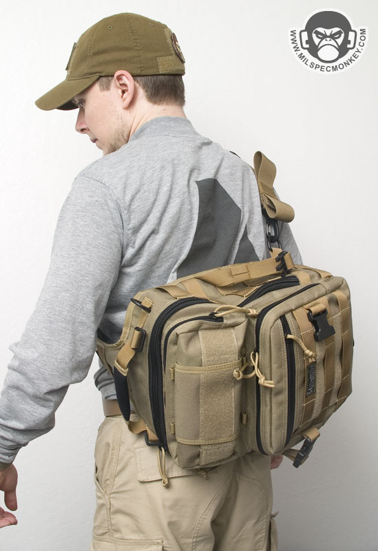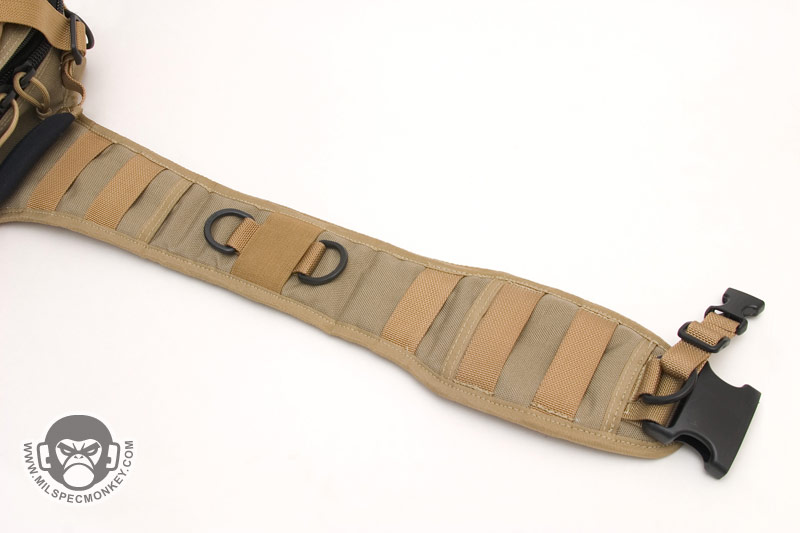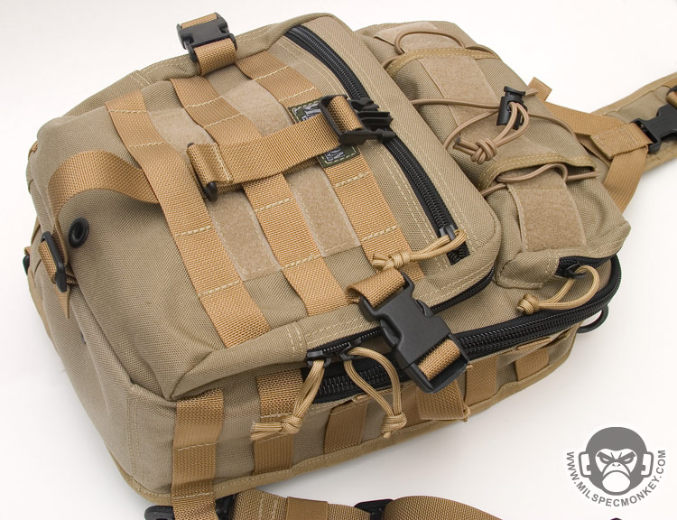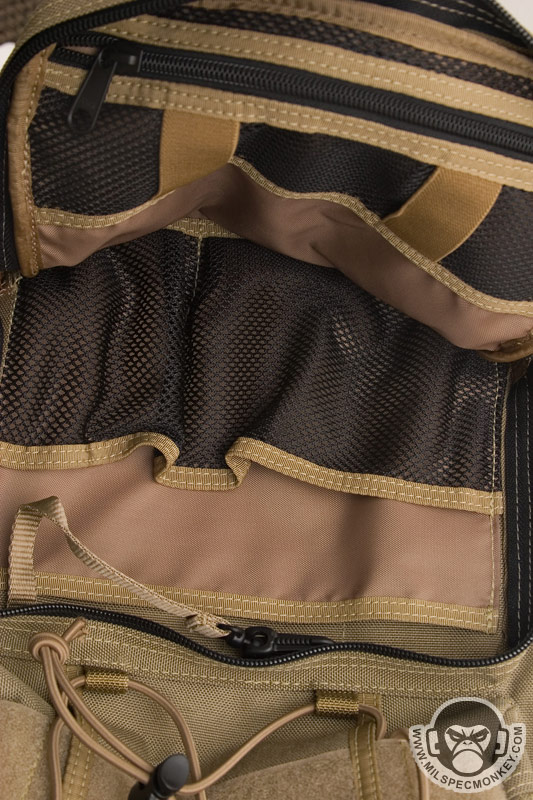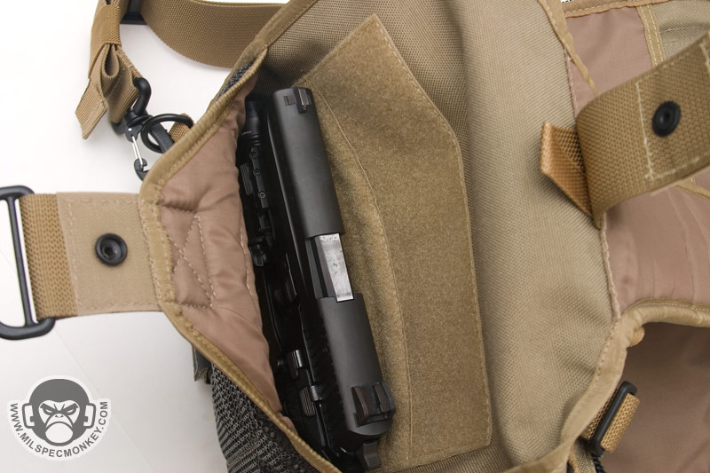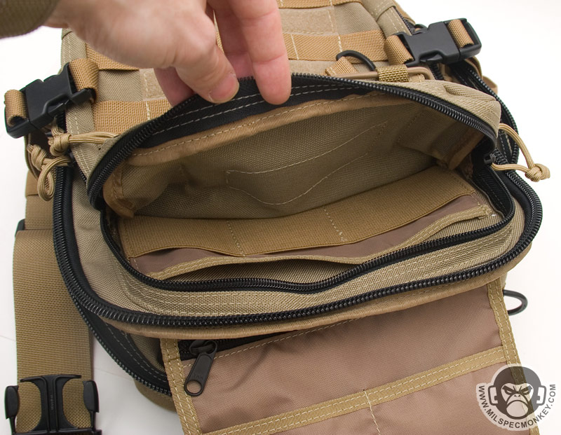 The front lower pocket has received a lot of upgrades. Starting with the outside, there are PALS loops of 3 rows x 5 columns in which the middle column is long. This allows for a good amount of space to addon a couple of pouches or a bigger one like the TacTile Large. In between the PALS are bonus 1" loop velcro strips for name tapes and the Maxpedition logo is even on the webbing out of the way, sweet! The inside of the front lower pocket has drastically changed from the Lunada which has more mesh now. The back side has a tall sleeve pocket with a mesh sleeve sewn on top divided into 2 sections. One section is about 1/3 total length and the other is 2/3 to give more holding options. The usual plastic lanyard keeper is also attached on this side. On the internal front side is a built in mesh zippered pocket with elastic loops to hold items horizontally. This zippered pocket isn't very deep for easy accessibility. The upper frontal external pocket is laid out like the Lunada, just slightly bigger. This includes a sleeve pocket in the back and elastic divided into 3 loops. The inside of the main compartment is also very Lunada-like, however now people have enough room for that ever-so common legal size paper with out folding. The inside still suffers the inner front flap dilemma which now is even bigger with 2 external sleeve pockets. Users will like it for organization or hate it for covering up their internal CCW area. Speaking of CCW, the back external CCW area is now VAST. I couldn't quite fit 2 full size handguns back there, but I could put a handgun in horizontally just to display a "cause I can" factor. I don't have one laying around, but this is likely big enough to fit a PDW inside like a MP5K or MP7. I was happy to see a large D-ring on the connection strap which is much easier to grab onto than the 1" D-Ring on the Lunada.