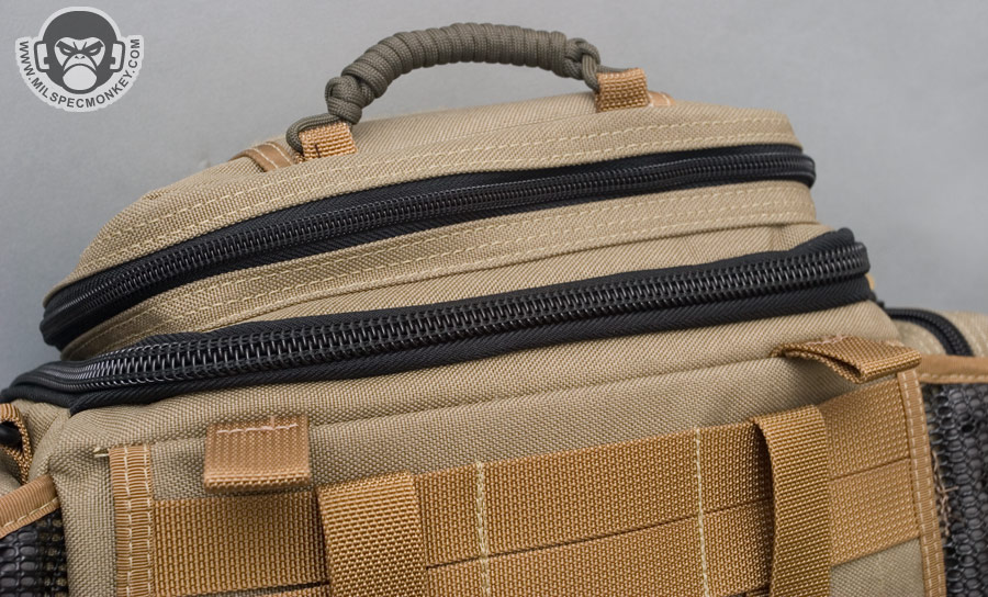 -Added 550 cord handle up top, only meant to be a quick grab. If I want a full on handle I will connect a shoulder strap to the top D-rings.