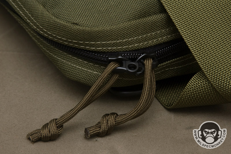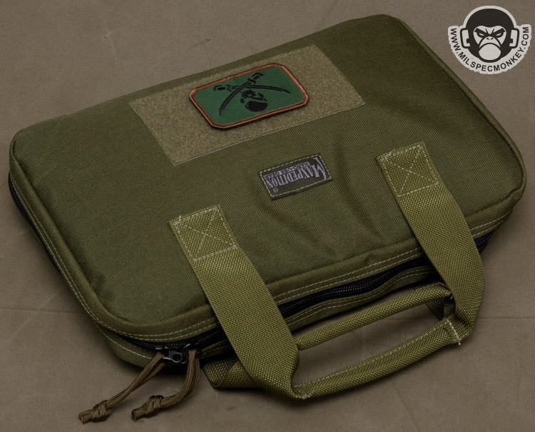 The main opening is a double zipper clamshell to allow a full fold out. As a nice touch these zippers are lock-able. Inside, one side has a nice piece of elastic webbing which can hold 5 pistol mags or similar sized items as shown. There is some extra space on the ends good for holding tools and pens. On the other side is a zippered pocket and loop velcro with hook velcro pieces included. I think the idea was in the right place, but I couldn't find a good use for these velcro strips. They didn't really seem to hold any of my pistol related items very well. For a change I recommend making the loop velcro the full width of the pouch so modular velcro pouches / panels can be used. As for the zippered pouch area this works just fine for putting your pistola in there. Both sides are padded to keep your hardware nice and protected. As you can see on this 8x12 version there is plenty of space to fit a tricked out pistol inside. In the center there are 2 pieces of elastic webbing which give some more gear holding options. Overall the case works well as a pistol holder as intended. When hitting up the range, it makes for a good setup for reloading, maintenance, and a place to safely lay your weapon.