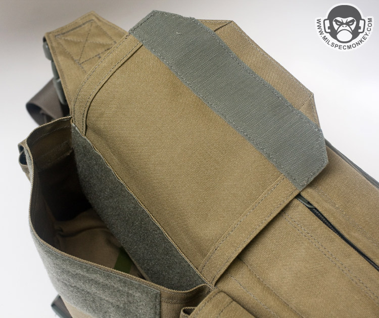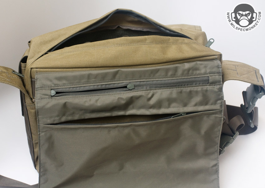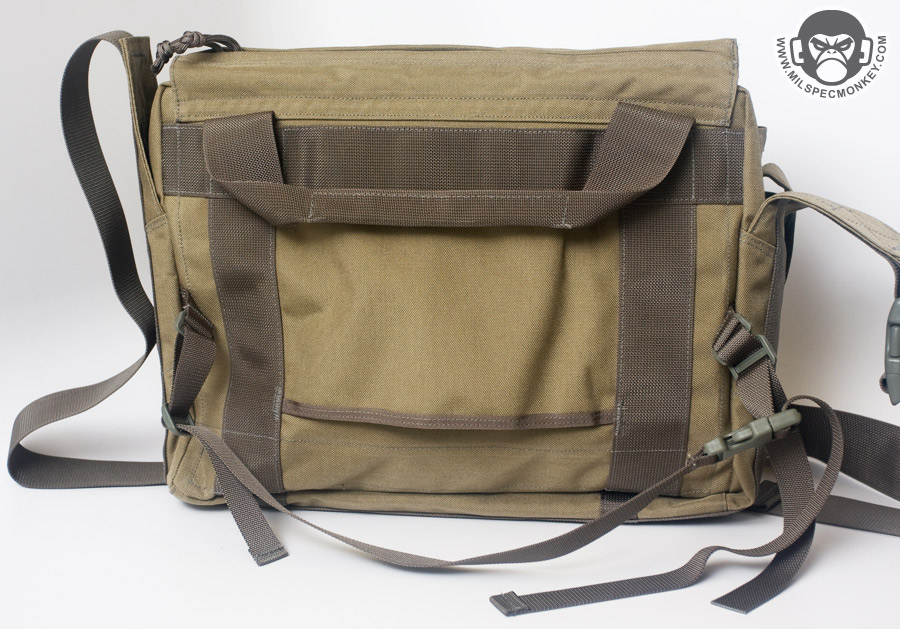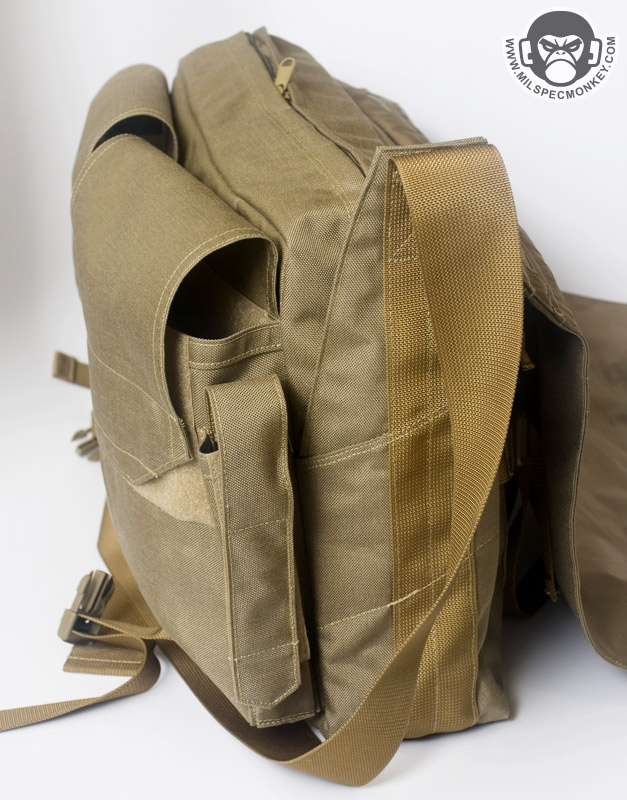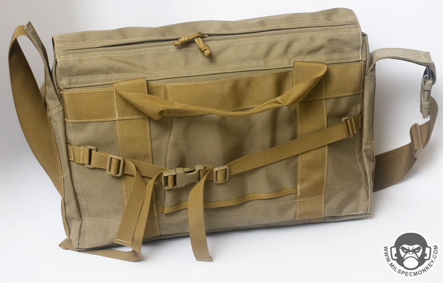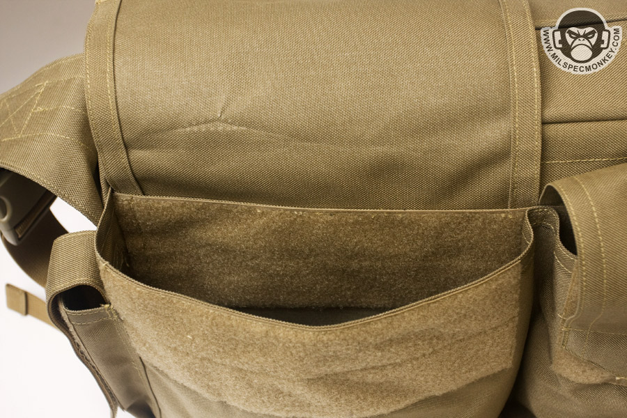Staying with the common messenger bag format, the main closure is a big ass flap that uses two 1" SRB buckles to secure. A generous amount of loop velcro is available for patches or nametapes. This setup is great for adjustability on load sizes, however kinda slow speed wise where the SRB buckles must be released or buckled when fully opening or closing the bag. To get around this classic drawback, there is a crafty double zipper on the upper back to allow quick bag access. The opening may not be as large as when the flap is open, however it works great for quick item grabs. A substantial handle is also on the upper back. Due to the placement it is more of a grab handle since when carrying it by only this handle the bag will hang at a tilt angle. The extra large piece of fabric on the back is somewhat sneaky where even I didn't know what the hell it was till I asked. Turns out, it is so you can easily mount the bags on roller luggage that have the telescoping handles. I'm kinda conflicted on the feature where it works as intended, however I don't think many messenger bag users travel with rolling luggage as well. In my opinion a simple sleeve pocket would be more useful. Also on the back is a 1" SRB waist strap setup that is good for securing the bag during movement. It is modular so can be removed if the user feels they will never use it.