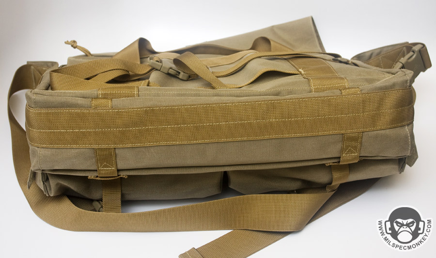 The main bag material is the 1000 D Maxpedition is known to use which although isn't waterproof, it is pretty darn water resistant. I think some of the classic biker messenger bags get carried away with their waterproofing acting like people haul loads of open tissues in hurricanes. Even then the sides of the flap usually are possible leak areas. Anyway my point is these bags offer solid water resistance, but if you really are worried about water, go get a real water proof bag over at Watershed. 2" webbing is used for the shoulder strap and as a nice touch one continuous piece is used which sewn to the bottom of the bag. This adds both bag holding durability and shoulder strap strength. No shoulder pad is included, perhaps since most messenger bags don't have one, but if desired one can be purchased as an affordable add-on. There is only 1 SRB so it promotes the bag being worn on the left side of the body for quick release capability. It would have been nice to have 2 SRB buckles for ambidextrous capability, but not a super big deal. The shoulder strap itself has a lot of slack to accommodate many body sizes using the tri-glide adjuster.