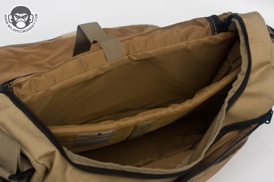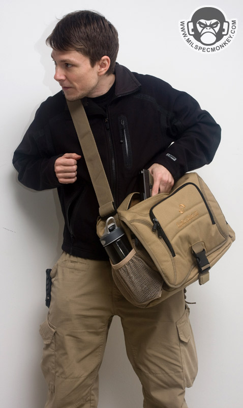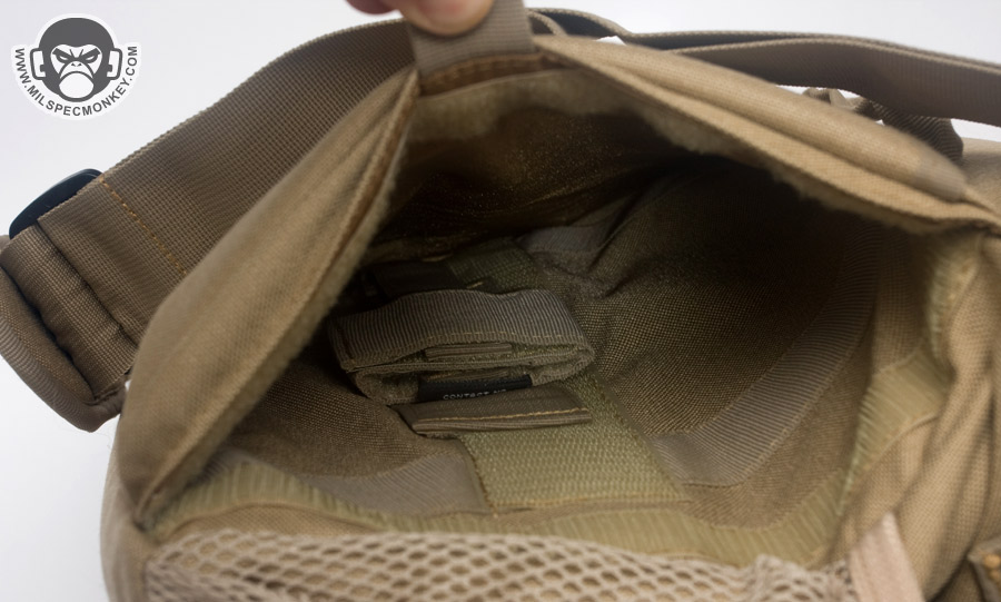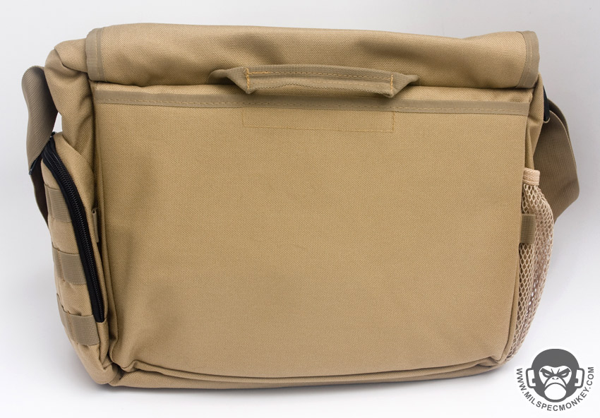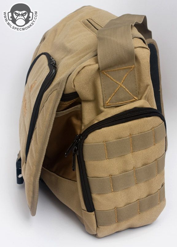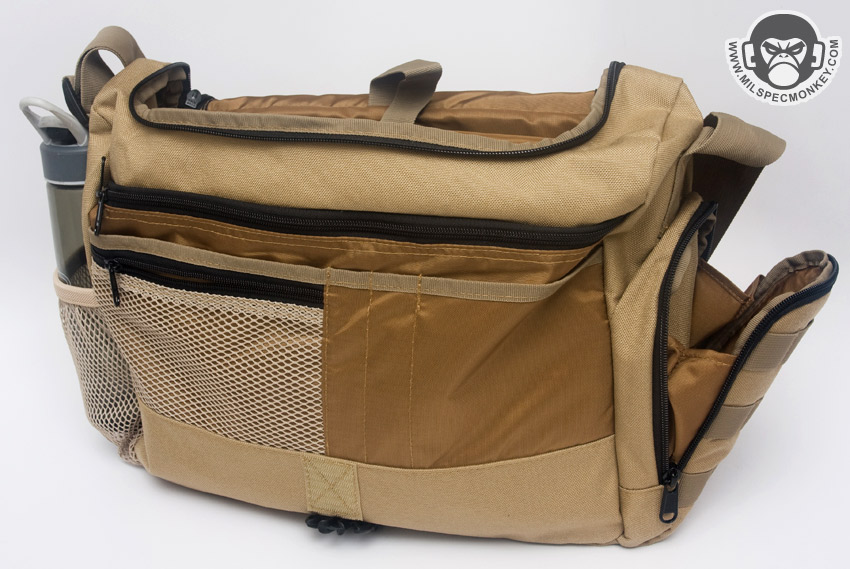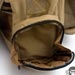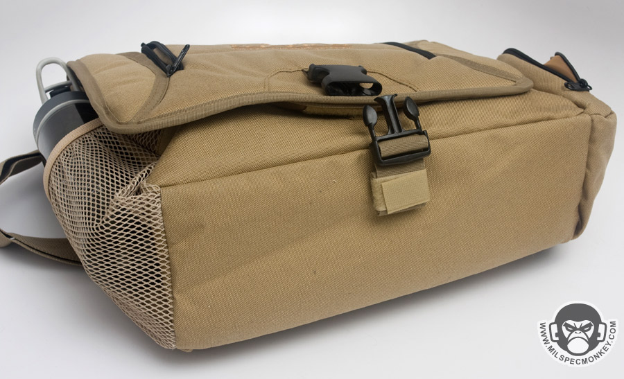 The shoulder strap is simple and comes with a non-slip pad. Tri-glides are used for size adjustment and the webbing is sewn on with an embroidery style variant box stitch. The exterior front pocket opens with double zippers. Inside is a sleeve pocket party with a plastic lanyard. As you can guess it is good for small papers and other thin admin items. The main flap can be secured with a SRB, which comes with a nice integrated velcro strap to manage the slack. When not using the SRB, the main flap is also held in place with a fairly small piece of velcro. It may not be big, yet it is all one needs to keep the flap in place and allow for easy opening. One side of the Jack Bag is a mesh bottle holder while the other is an accessory pocket. The bottle pocket will accommodate most personal sized containers. There was a small quality control issue where the mesh was ripping out in some places on my Tan bag sample, however all was well on the black one. Other than that the materials and quality seemed solid on the bags. Back to the accessory pocket, it uses dual zippers and has PALS webbing on the exterior. Folding sides are in the interior to assist in keeping goods inside even when the pocket is fully opened. Now I like PALS webbing as much as the next tac guy, but it may have been better to leave it off this side pocket in the spirit of a more discreet look. I don't really see myself adding another pouch on this side as it would make the bag a little awkwardly long and may negatively affect ease of use on the accessory pocket. Up on top of the Jack Bag is a zipper to get access to the interior without messing with the flap. Having a zipper at all is great, but the zipper length is a little short. Only smaller items will fit through the opening and it tends to take both hands to really open up the hole to be able to see items inside. I know the bag isn't super big to begin with, but I think this zipper could be longer without negative results. The back side has a grab handle and a large sleeve pocket with velcro closure. Good thing the handle is there as the pocket is a little difficult to open if not grabbing onto it. Perhaps a pull tab would make things easier for one hand operation.