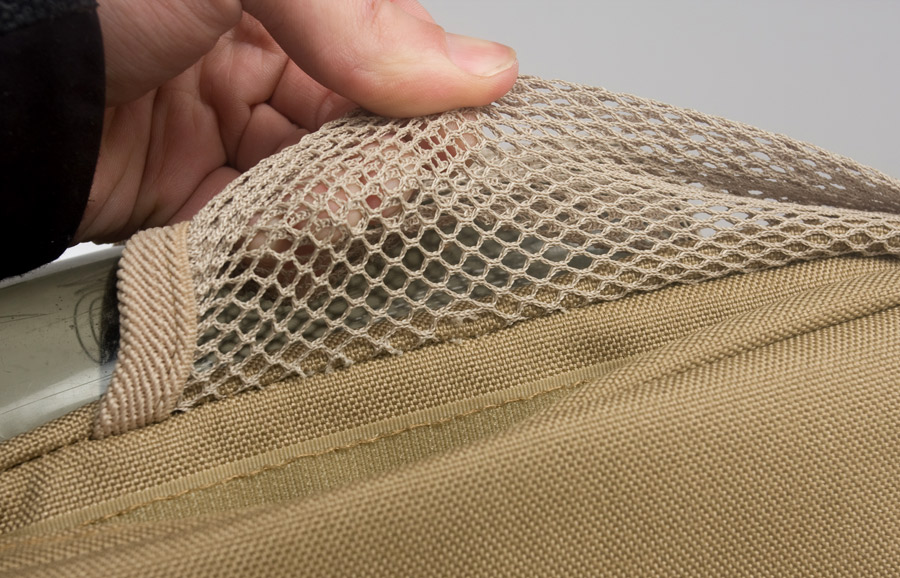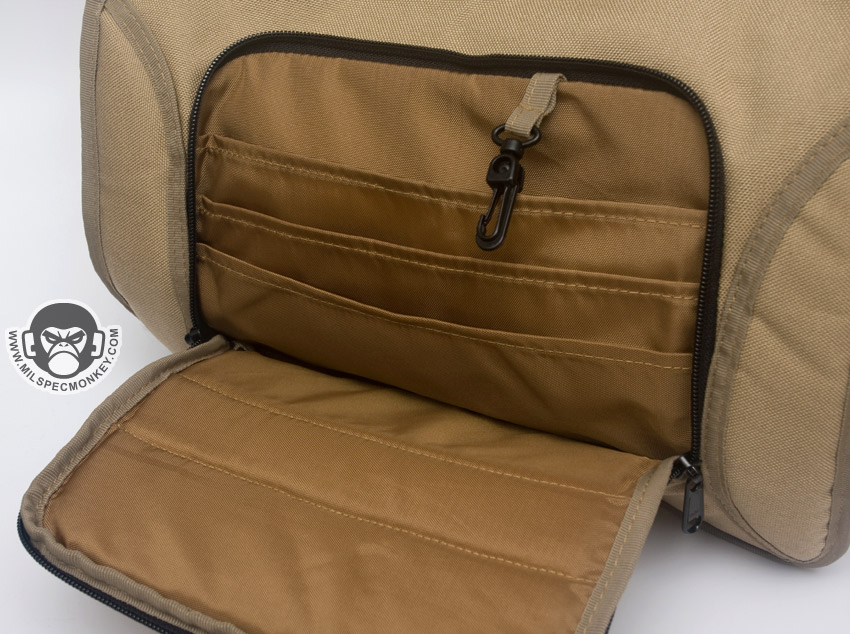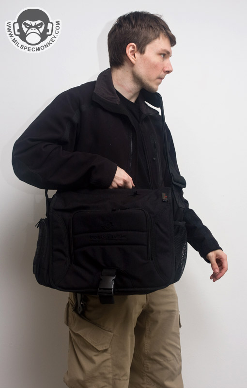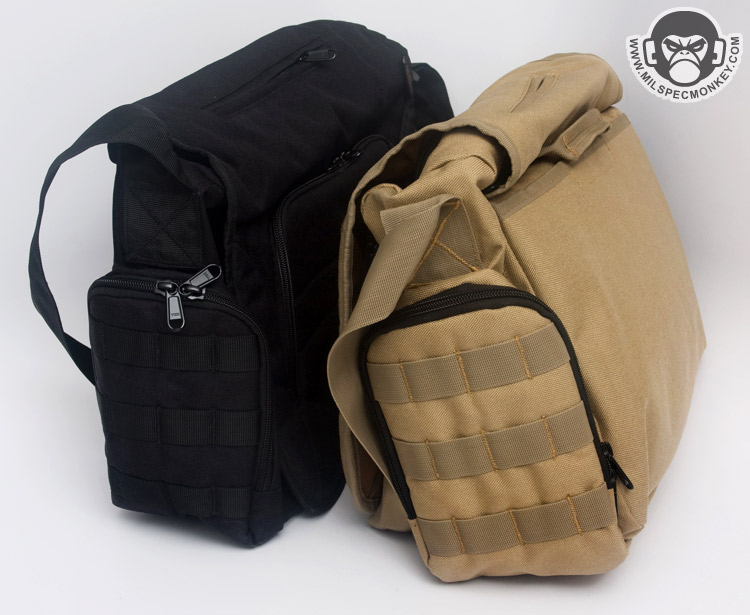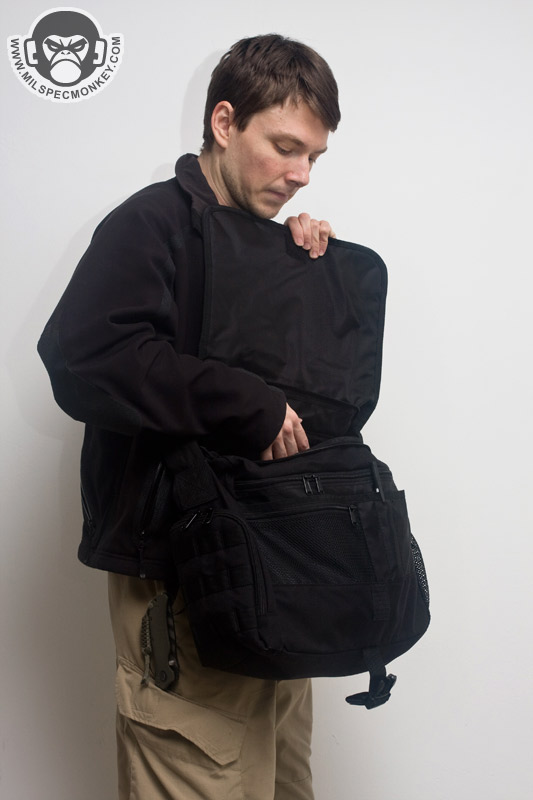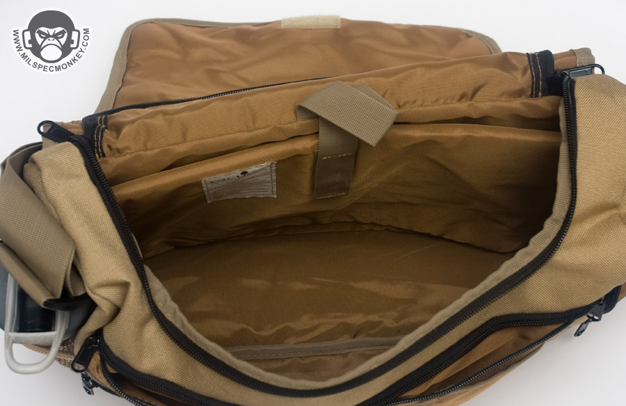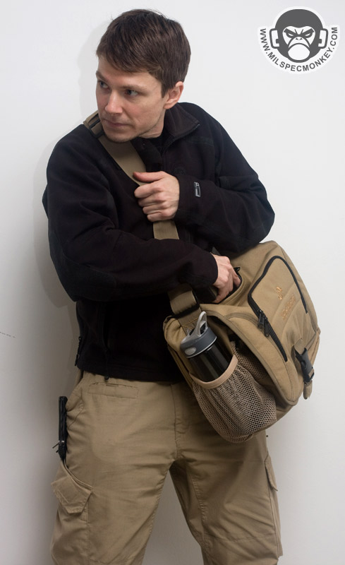 The shoulder strap is simple and comes with a non-slip pad. Tri-glides are used for size adjustment and the webbing is sewn on with an embroidery style variant box stitch. The exterior front pocket opens with double zippers. Inside is a sleeve pocket party with a plastic lanyard. As you can guess it is good for small papers and other thin admin items. The main flap can be secured with a SRB, which comes with a nice integrated velcro strap to manage the slack. When not using the SRB, the main flap is also held in place with a fairly small piece of velcro. It may not be big, yet it is all one needs to keep the flap in place and allow for easy opening. One side of the Jack Bag is a mesh bottle holder while the other is an accessory pocket. The bottle pocket will accommodate most personal sized containers. There was a small quality control issue where the mesh was ripping out in some places on my Tan bag sample, however all was well on the black one. Other than that the materials and quality seemed solid on the bags. Back to the accessory pocket, it uses dual zippers and has PALS webbing on the exterior. Folding sides are in the interior to assist in keeping goods inside even when the pocket is fully opened. Now I like PALS webbing as much as the next tac guy, but it may have been better to leave it off this side pocket in the spirit of a more discreet look. I don't really see myself adding another pouch on this side as it would make the bag a little awkwardly long and may negatively affect ease of use on the accessory pocket. Up on top of the Jack Bag is a zipper to get access to the interior without messing with the flap. Having a zipper at all is great, but the zipper length is a little short. Only smaller items will fit through the opening and it tends to take both hands to really open up the hole to be able to see items inside. I know the bag isn't super big to begin with, but I think this zipper could be longer without negative results. The back side has a grab handle and a large sleeve pocket with velcro closure. Good thing the handle is there as the pocket is a little difficult to open if not grabbing onto it. Perhaps a pull tab would make things easier for one hand operation.