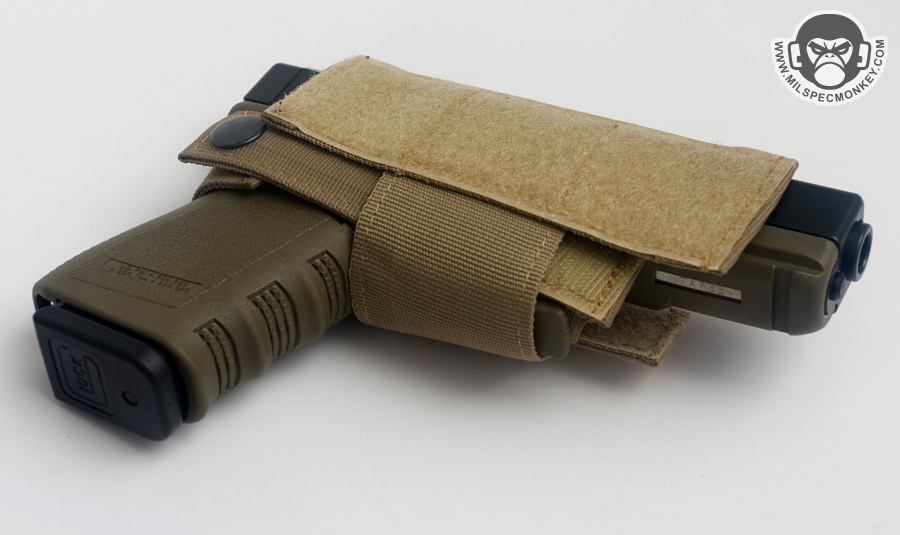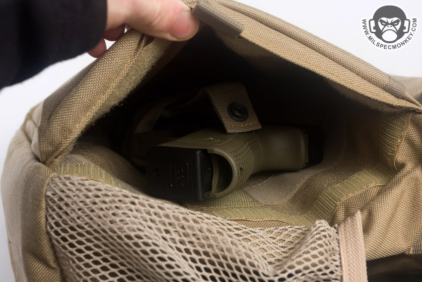 Behind that back sleeve pouch is a pretty sneaky compartment for some CCW action. There is access on both sides for ambidextrous capability which use velcro closure and have webbing pull tabs. Unfortunately the tabs are pretty small compared to the force needed to open the area if fully sealed. Making a larger pull tab and adding some 550 cord would help a lot as speed and ease is quite important in this area. The interior comes with an adjustable holster which is nice, but the setup is a little janky. The holster itself is harder than it should be to wrap around most pistols and didn't really have enough wrap length to go around my Glock 19 (not exactly huge). Not that much velcro connection was available to keep the wrap sealed. The retention snap is a plus to include, but the female snap side should have a stiffened extension to make releasing easier. As an odd decision, hook was used on the interior of the compartment for mounting which is abrasive to your hand and your weapon. Loop would have been a better a choice and more of it than a thin strip to allow some holster angle adjustment.