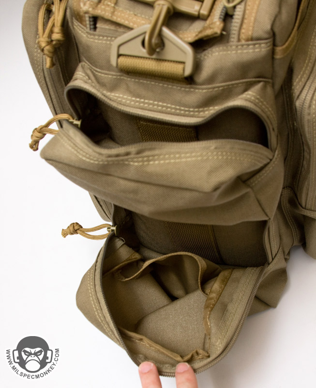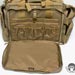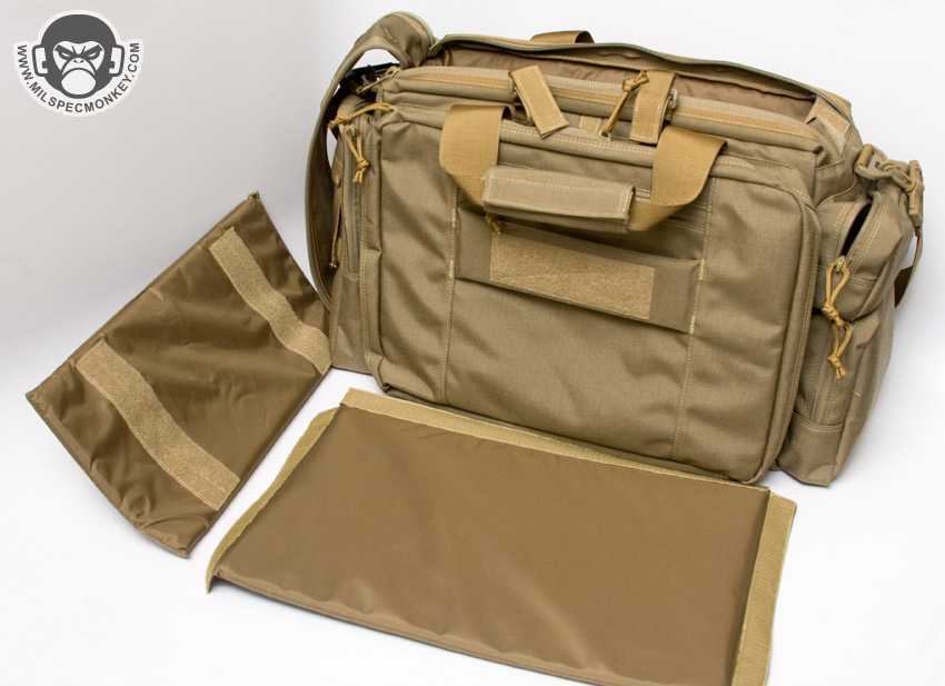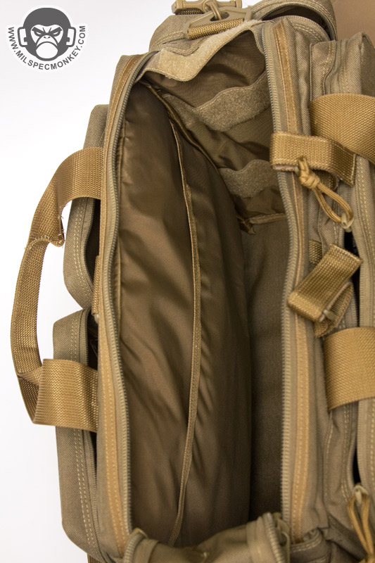 Down into the interior of the whole bag, things are fairly simple, yet with some options. One side is a sleeve pocket while the other has a good patch of loop velcro so one can add CCW action or velcro accessory pockets. The ends also have loop areas, however they are for attachment points for the divider pad. A bottom pad is even modular so one can decide if they want the padding rigidity or to take it out to offer maximum holding space. With this modularity one can accommodate many items with a good fit ranging from laptops, piles of tac gear, to larger sized video cameras.