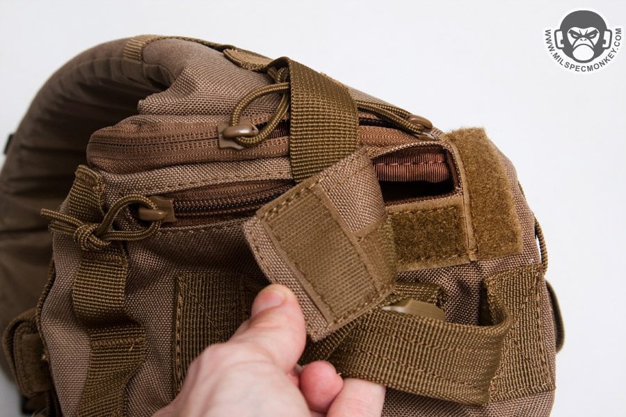 The top sports another drag handle and has a 1" strap under it connecting to the main shoulder strap. Despite looking out of place, this strap actually helps adjust how the pack fits on the user's back. Nearby is a velcro flap for hydration tubes and a zipper opening for alternate options such as for antennas. This slot can also comes in handy if putting a rifle inside that doesn't quite fit, allowing the barrel to stick out of the top. The hydration pocket has an opening so both these ports can be reached through the hydration or main compartment.