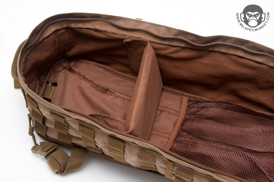 The main compartment opens up with dual zippers and with the compression straps released, makes quite a full opening for easy access. The back has a mesh pocket with elastic top and the flap interior has good sized zippered mesh pocket. The sides are lined with tricot like a camera bag to interface with the supplied divider. The divider is great for sectioning off the pack or can help cushion if having a SBR upper and lower inside. It would be nice if another divider was supplied as that would be handy for smaller item setups like medic bags. As for what can actually fit in this main compartment, it lends itself to holding multiple medium sized items, but not so much on larger gear such as a helmet wont fit. However, there is plenty of room for an E&E, medical, or bug out bag type setup. I was able to fit my medium sized camcorder inside and even used the divider to make room for power supply / wires storage. Keep in mind if you try and use it as a daily pack, it won't fit some common items like say a legal sized sheet of paper without bending or folding.