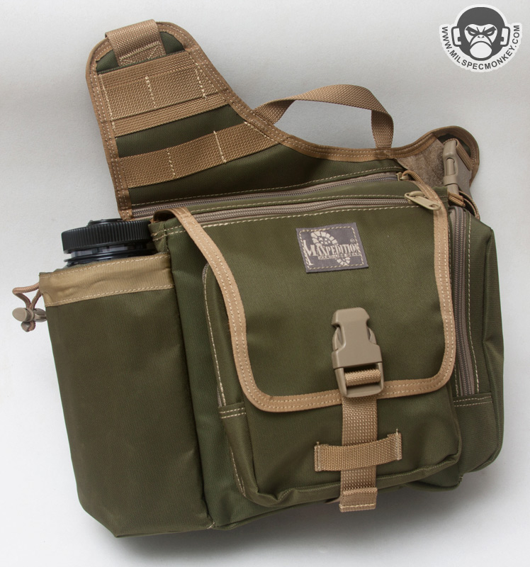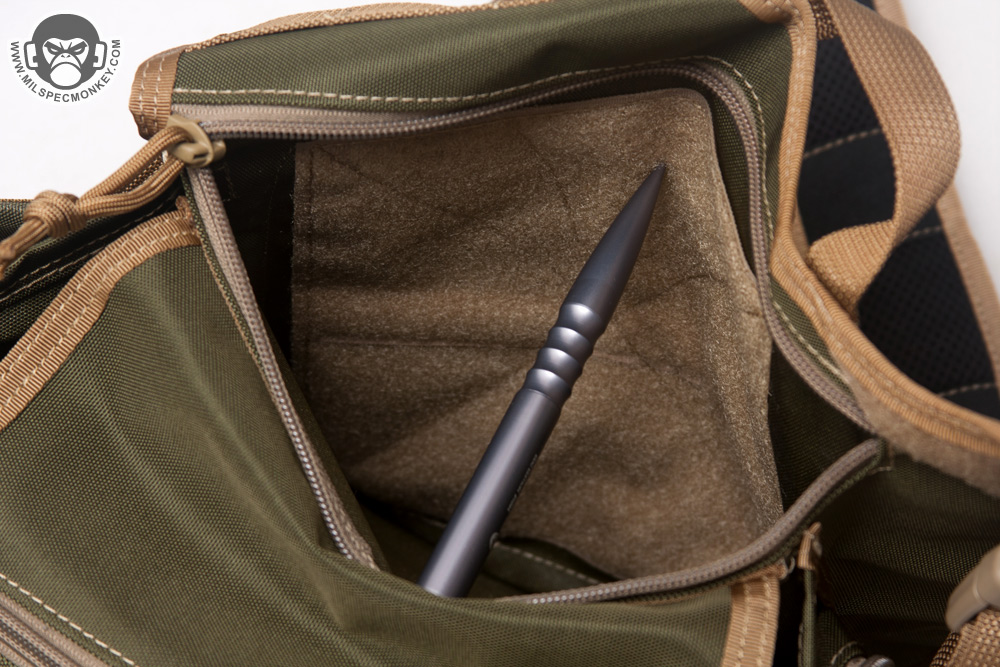 The main key points that makes up the KISS is that it is is shoulder based bag with a main compartment, CCW slim pocket, open top adjustable hydration pocket, side zippered GP pocket, and a frontal rectangular zippered pocket. The hydration pouch has been slightly simplified where it adjusts with an exterior cordlock to squeeze in on the upper sides. Adjustment allows accommodation to both the popular Camelbak and Nalgene bottles. Budget version or not, I wish there was a grommet at the bottom of this area as it is pretty common to get one's hydration pocket wet. On the other side is the GP pouch which opens with a single zipper. On that note, all the zippers on the KISS except the CCW area come with standard metal sliders rather than 550 cord. No big deal as fans of cord can easily make the mods for cheap. The GP pouch offers some good holding height, but is otherwise simple with no extra webbing or sleeve pockets. The main flap has been simplified only having an incorporated slim zippered pocket and connecting with a 1" SRB. Once opened the main compartment is easy to access as there is no rain / parachute style cover. I thought that was worth noting as some users actually didn't like it on the Jumbo anyway. Besides the grommet, the main compartment doesn't have any other special features, but as an extra note I like how it seems to keep its expanded shape making it easier to access. The frontal pocket offers an exterior sleeve pocket and then a nice rectangular shape for the interior accessed by a single zipper. Not to be forgotten, in the back is the CCW compartment which offers a good sized opening with a single zipper. The interior offers a generous 6.5” x 8” loop field that is actually more than you get on the standard Jumbo. The main intent is for a pistol, but with all the cool velcro mount pouches Maxpedition now offers, you can get pretty creative for other uses.