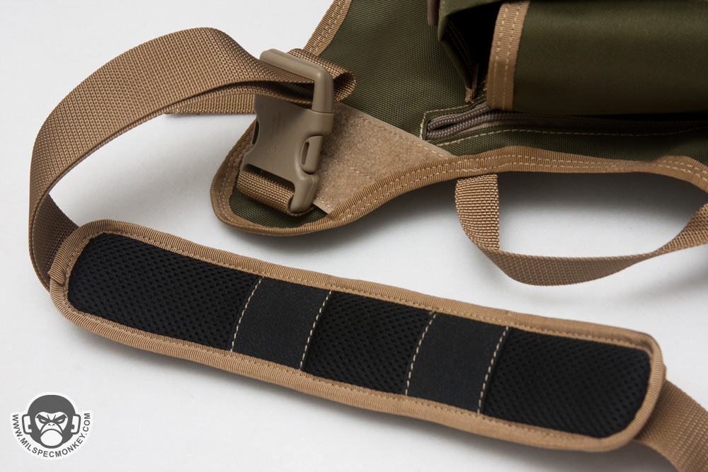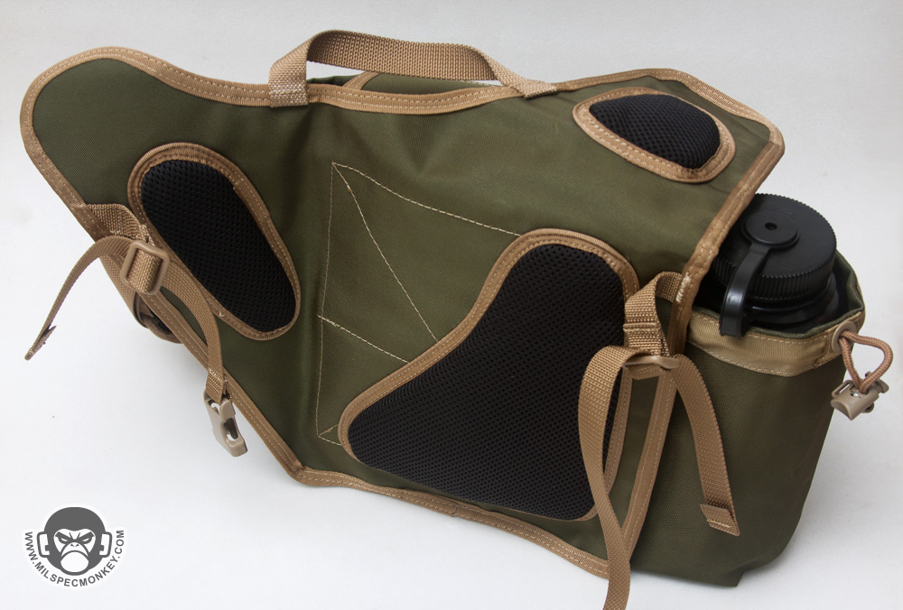 The shoulder strap setup is pretty much the same classic Jumbo style, but comprised of a 1.5" main strap instead of 2". The usual shoulder pad is included which always helps quite a bit with comfort. Although a lot of webbing was taken off on the KISS, a good dose of PALS webbing still remains as a part of the strap area. One side offers PALS webbing and a stash pocket for items like knives, while the other side is a more generic connection point using 2" webbing and loop velcro. The 2" webbing is curious to me at first, but I can see it acting as a "belt" platform for mounting those type pouches to and the velcro is there for patches when not covered. The drag handle is even included which was not on earlier Jumbo designs at all. The back area that touches the user has stayed overall the same offering 3 pad zones. Since the same black airmesh material is used, it is comfy, yet still is one of the most fragile materials on the pack. It will fuzzy up over time and make sure to keep hook velcro away! The belt connection is gone likely since not many people were making use of it anyway.