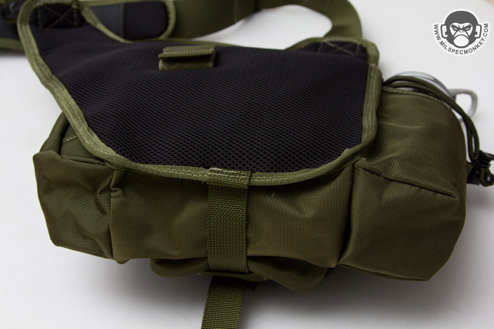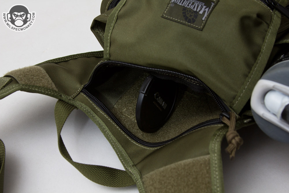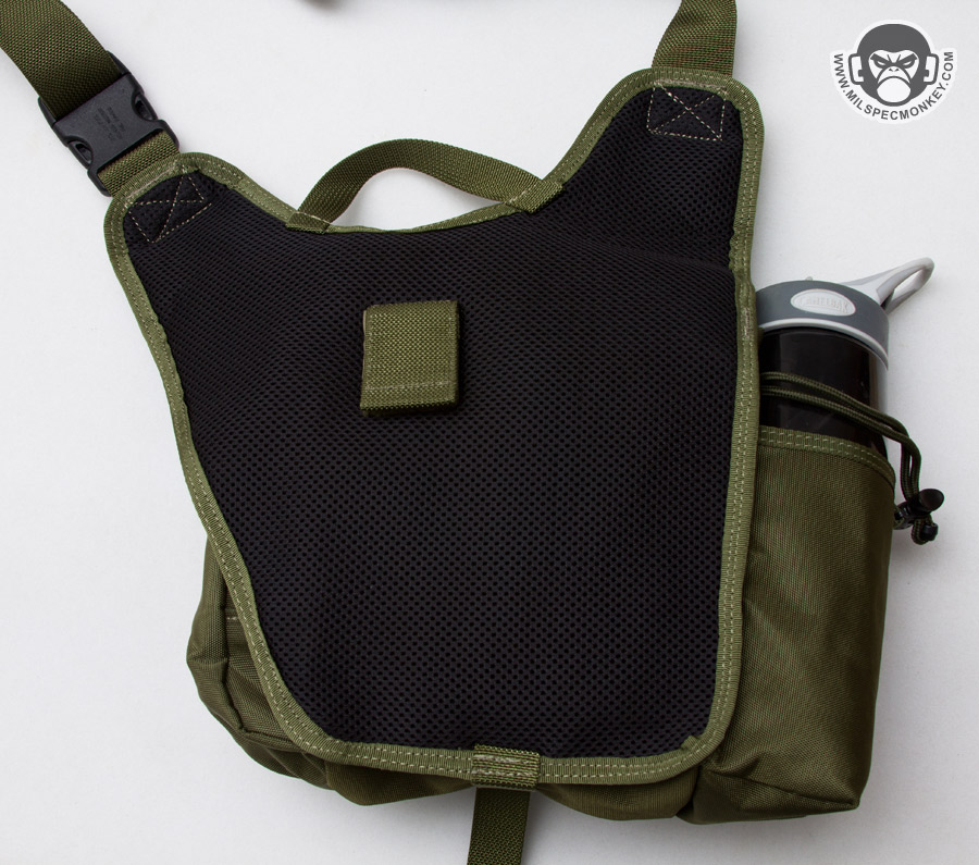 For some of the other changes, the shoulder strap is now 1.5" rather than 2" and the HK snap is a simple plastic D-ring. Ladies will probably like the more slim strap, but those who weighted down their Fatboy may miss the wider 2" strap for long wear comfort; Don't worry the shoulder pad is still included. The phone pouch and extra webbing have been dropped for simple webbing zones with loop to allow patches or Maxpedition sheath pouch attachment. Due to requests in the past a drag handle has been actually added. Rather than a belt snap, the back uses a velcro flap as seen on the Jumbo series. The result will likely be more comfortable for most as the velcro flap lays more flat against one's body. The same back mesh padding is used which is comfortable, however definitely the durability weak point on the bag having the least abrasion resistance and gets thrashed by hook velcro. As a more substantial change, the secondary compartments are totally different. The GTG now has a water bottle pocket and a GP pocket where the original fatboy had the GP pouch on the other side and a flashlight / sheath pocket. It will depend on the user, however I think most will welcome the addition of the water bottle pocket. Personally I'd rather have the water pocket on the other side so easier to access when worn on the right-hand side, the balance I suppose is the GP pouch would be a pain to access (requiring bag shifting for most) if that was done. On that note, to swap the layout there is the option one could get the S-type (lefty) version and just wear it on the right, just keeping consideration the CCW zipper will open the opposite direction. Sadly there is no grommet on the bottom of the water bottle pocket, or anywhere on the bag for that matter, but not a deal breaker.