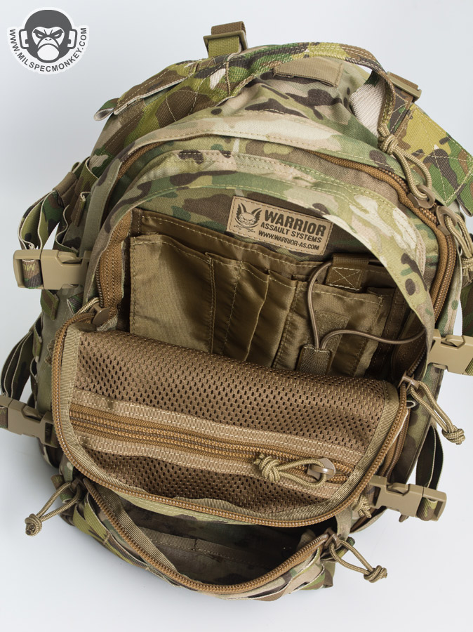 As seen on all their gear, Warrior Assault Systems doesn't pull any stops on using the best in materials as expected in a military class pack. The foundation is 1000D Cordura with Mil-Spec webbing and even ITW hardware, all good stuff. Something that is new, to me at least, is the padding used on the rear of the pack. The 3D mesh used has a mil-spec mesh main exterior, but then has this deep and porous foam inside to offer great body standoff and airflow. It truly is a great balance of getting the durable mesh on the exterior with not just padding, but padding that can breathe. The whole back panel itself has padding along with the shoulder straps to give more comfort with heavier loads. All the usual tactical features are on the straps as usual such as D-rings and a sternum strap, yet upper strap adjustment hardware exists as well to help really customize the pack fit; this usually is only seen on larger packs. As another nice attention to detail, the webbing used to make the drag handle up top, goes down the sides all the way to the bottom to maximize overall pack strength. It may be pretty uncomfortable (due to no waist strap) to hold 50 pounds of ammo in the Pegasus, but very cool to know you could if you wanted to. If you haven't noticed yet, it is a PALS webbing party in general on the exterior. There is PALS on the sides, the 2 frontal pockets, and even the bottom so one can get pretty rowdy with pouch addition options.