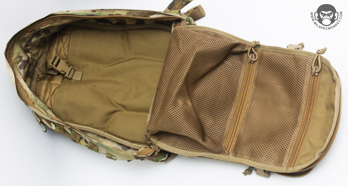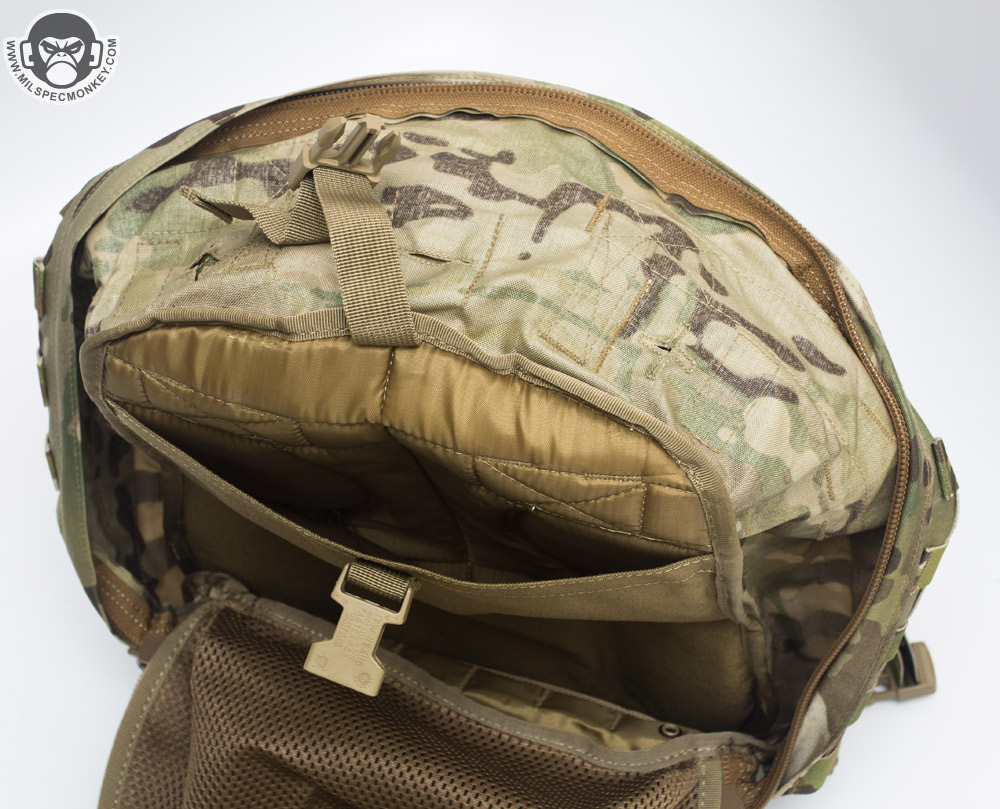 Onto the big show main compartment, it opens up with double zippers in a clam-shell style to offer full access. The exterior compression straps can be used to limit this effect if desired. 2 mesh zipper pockets are on the front interior with the top one being overall slim while the lower one has some baggyness to it. These are great for general organization for gear such as medical items. Over to the back side is a simple hydration pocket zone that has an SRB closure. Since the back area is padded, one could alternatively store a small laptop / tablet back there. Additionally up top is the center hole covered by elastic and then 2 more ports with velcro flaps on the sides to offer access to any sort of hydration tube or antenna needs.