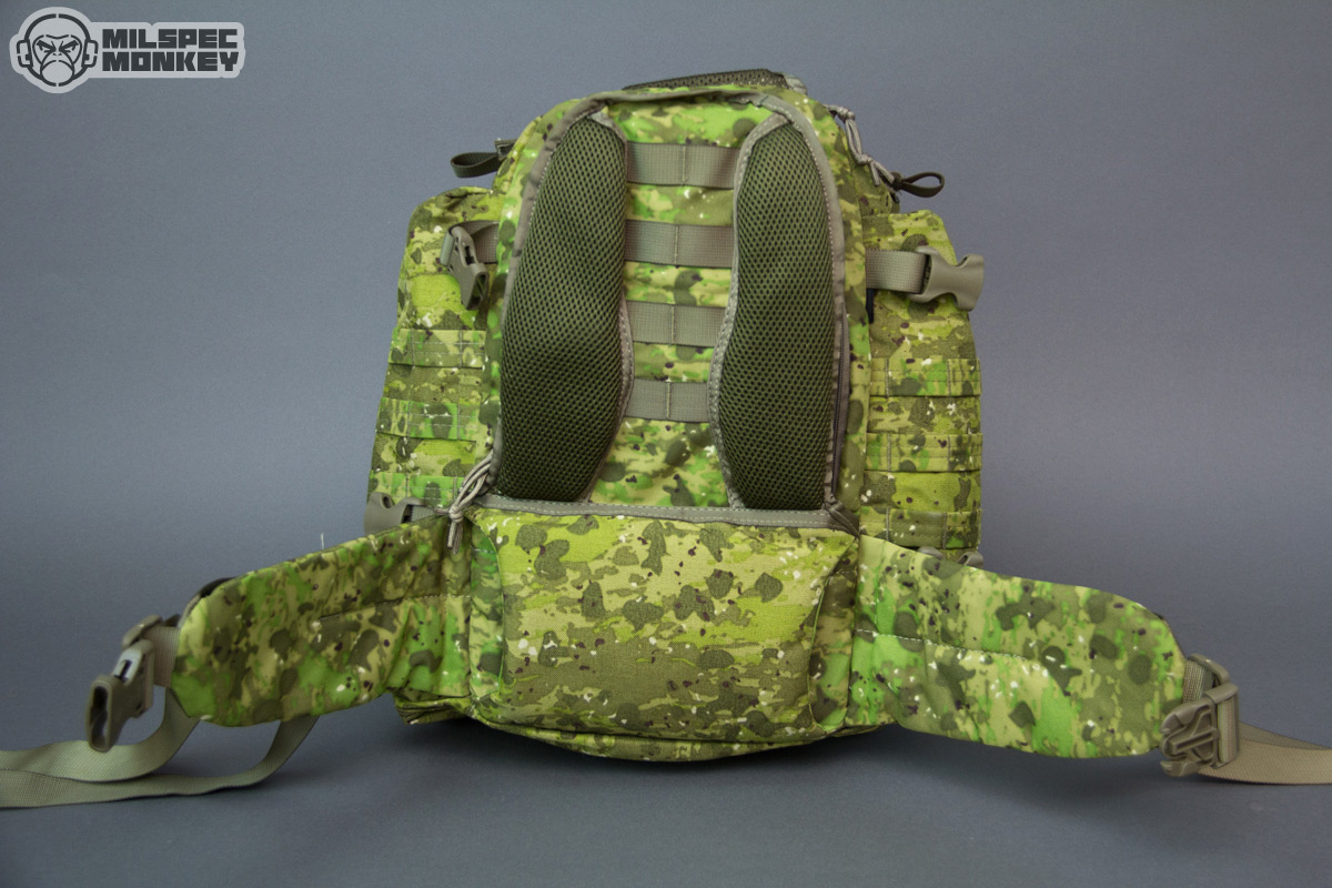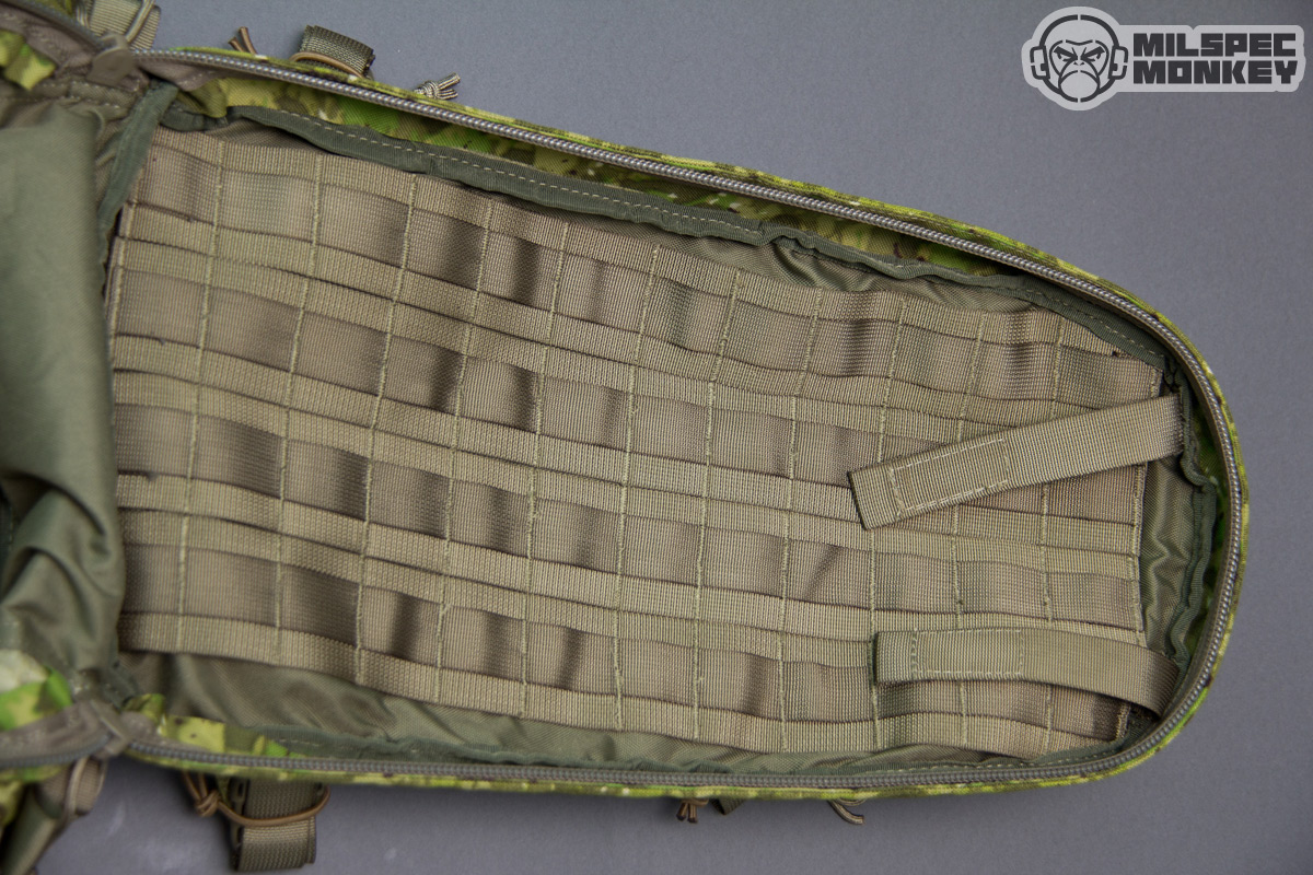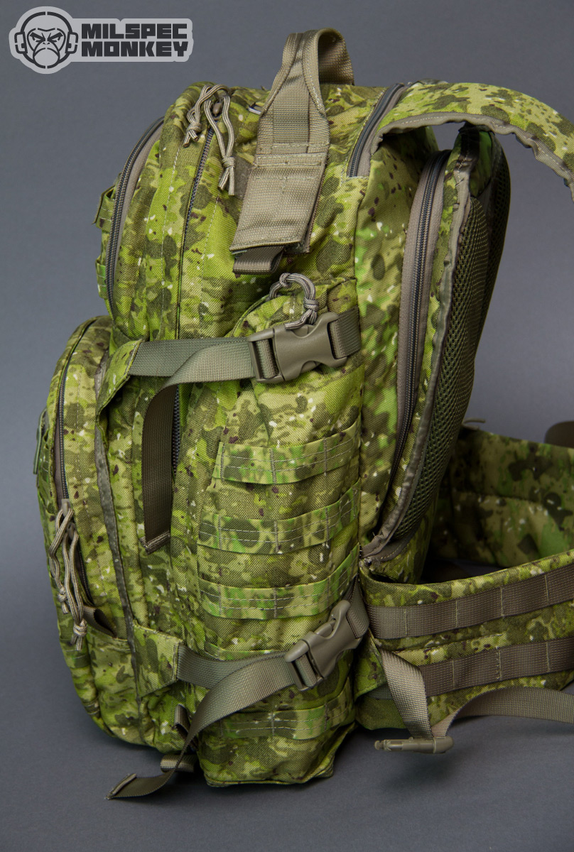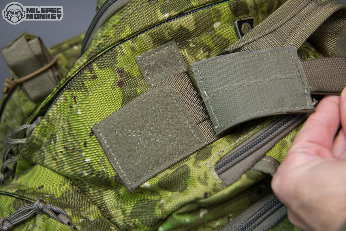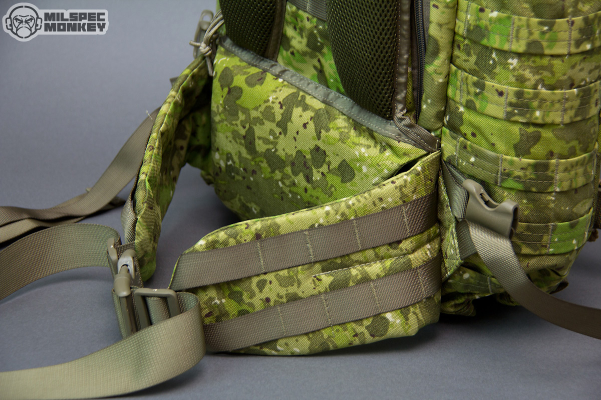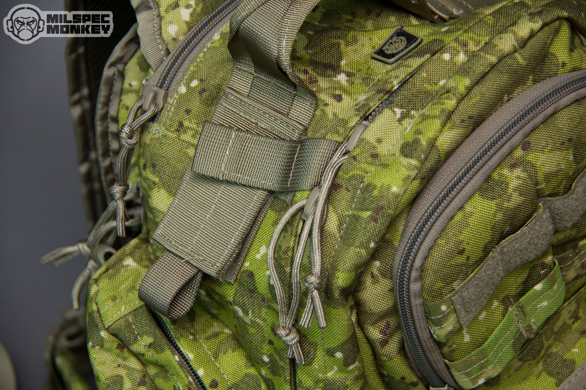 Starting with the exterior, there is a good dose of PALS webbing using fabric style so it matches the camo of the rest of the pack. One might be curious about the pattern shown which happens to be called JABA POLYOVA (Field Toad) and was developed by P1G-TAC. It has a pretty good range for brighter green areas including forest and tropical zones. I'll try not to ramble on too much about it since I'll show off more later, but it works pretty nice in my current healthy foresty Oregon area. Back to the PALS webbing there is a 4+ column x 4 row setup on the lower front. I say + since there are some extra slots, but they are off-spec short. Upper front has 4x2 and then 3x5 on the sides. There is even 3+ x 2 on the padded belt sides, they aren't fabric color matched like the other zones, but good ol' webbing will do. On that note, The color used for webbing, binding, hardware, and hook-and-loop is overall a bit grey in comparison so not exactly a perfect match with the overall green Field Toad Camo. Maybe their OD was too dark, but tan499 might have worked out a little better. I'm aware how getting custom colors for every detail is no fun so I'll guess P1G-TAC considered their options. It isn't PALS spec, but there is some bonus webbing on the main shoulder strap for routing or adding small pouches. There is even some webbing down the back middle, the intent is a bit unclear with my best guess at offering options to mount the pack directly to a vest.