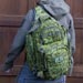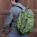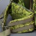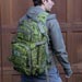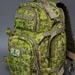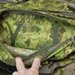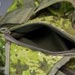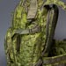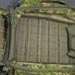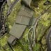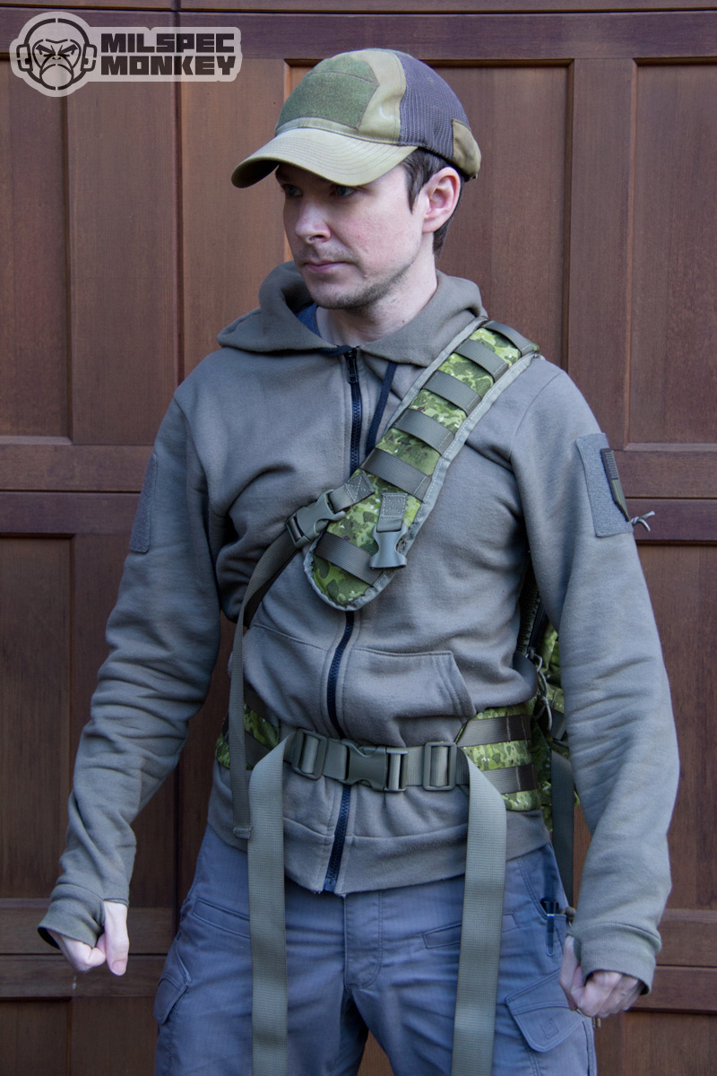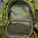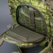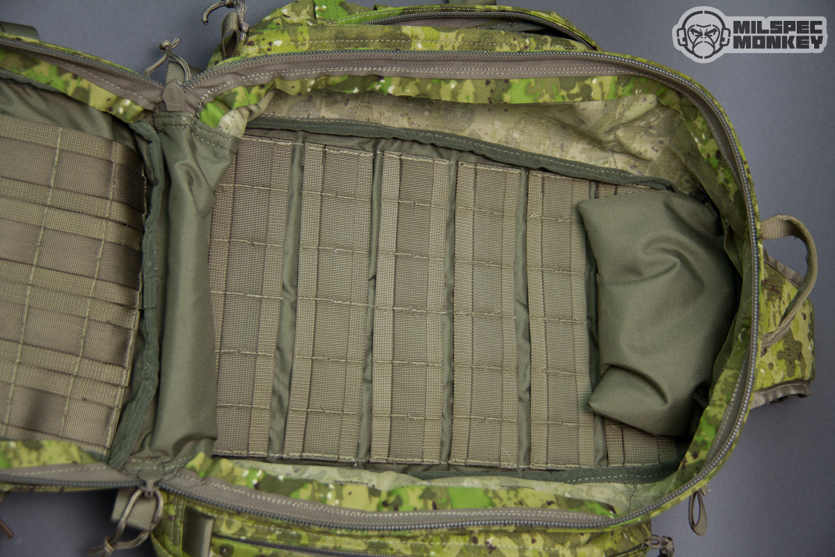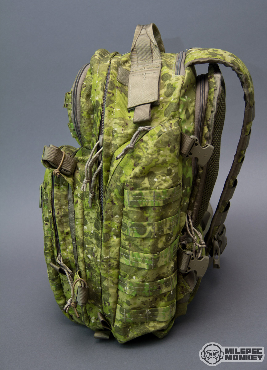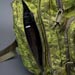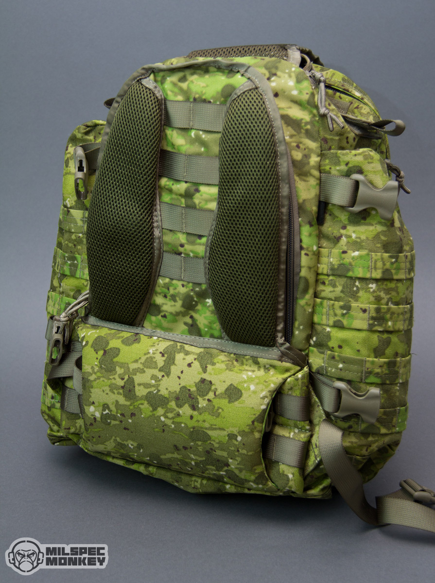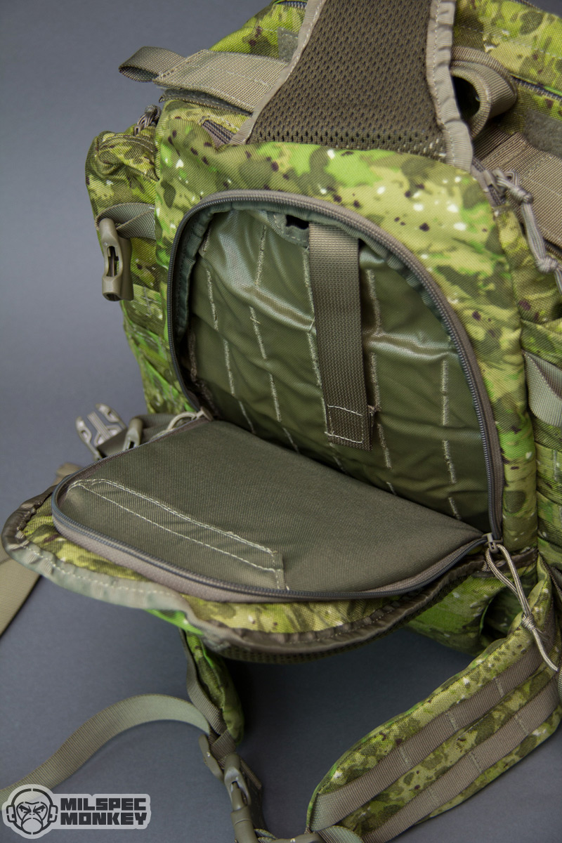 Starting with the exterior, there is a good dose of PALS webbing using fabric style so it matches the camo of the rest of the pack. One might be curious about the pattern shown which happens to be called JABA POLYOVA (Field Toad) and was developed by P1G-TAC. It has a pretty good range for brighter green areas including forest and tropical zones. I'll try not to ramble on too much about it since I'll show off more later, but it works pretty nice in my current healthy foresty Oregon area. Back to the PALS webbing there is a 4+ column x 4 row setup on the lower front. I say + since there are some extra slots, but they are off-spec short. Upper front has 4x2 and then 3x5 on the sides. There is even 3+ x 2 on the padded belt sides, they aren't fabric color matched like the other zones, but good ol' webbing will do. On that note, The color used for webbing, binding, hardware, and hook-and-loop is overall a bit grey in comparison so not exactly a perfect match with the overall green Field Toad Camo. Maybe their OD was too dark, but tan499 might have worked out a little better. I'm aware how getting custom colors for every detail is no fun so I'll guess P1G-TAC considered their options. It isn't PALS spec, but there is some bonus webbing on the main shoulder strap for routing or adding small pouches. There is even some webbing down the back middle, the intent is a bit unclear with my best guess at offering options to mount the pack directly to a vest.
