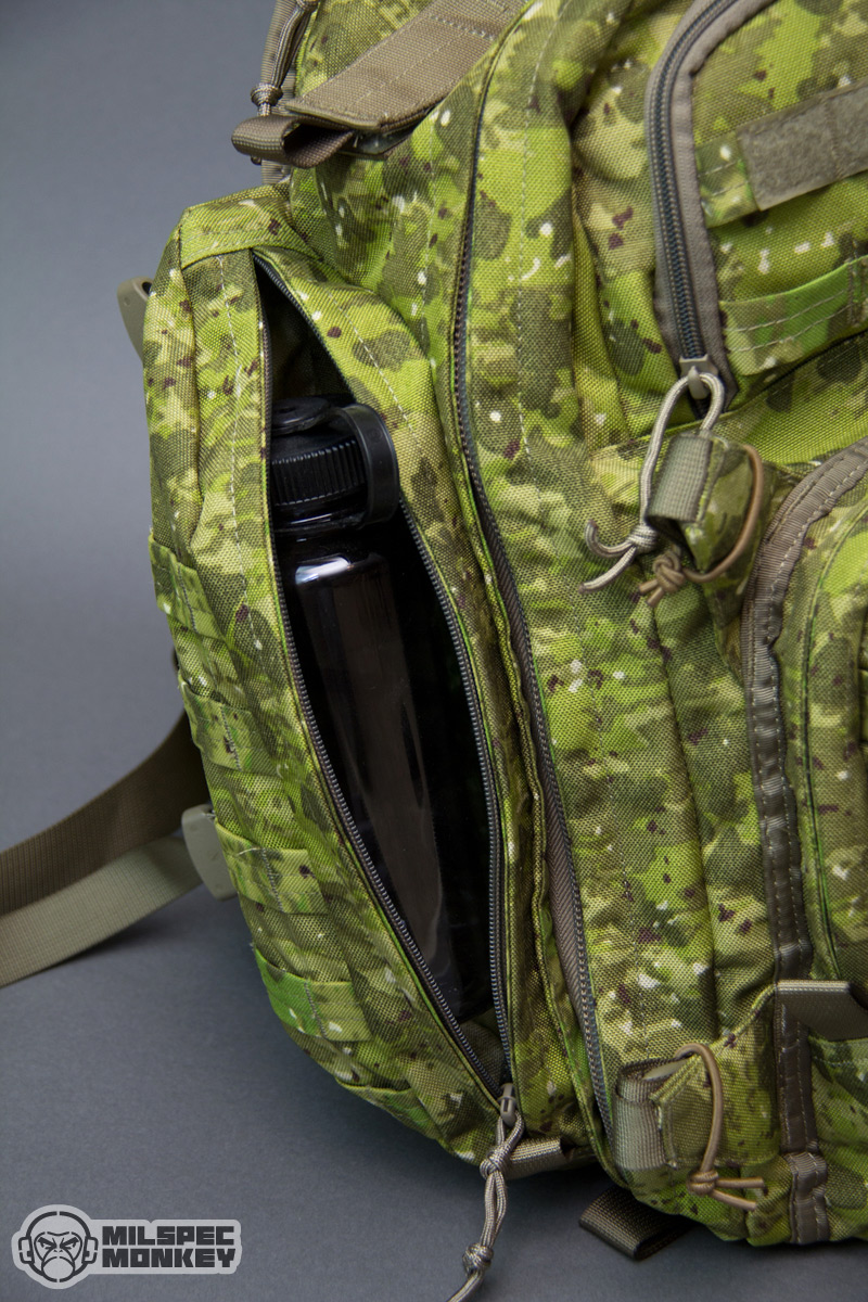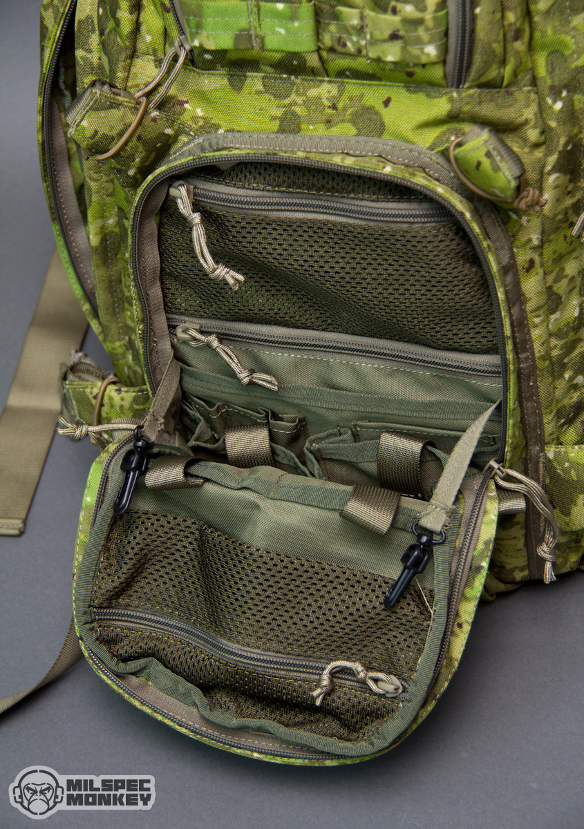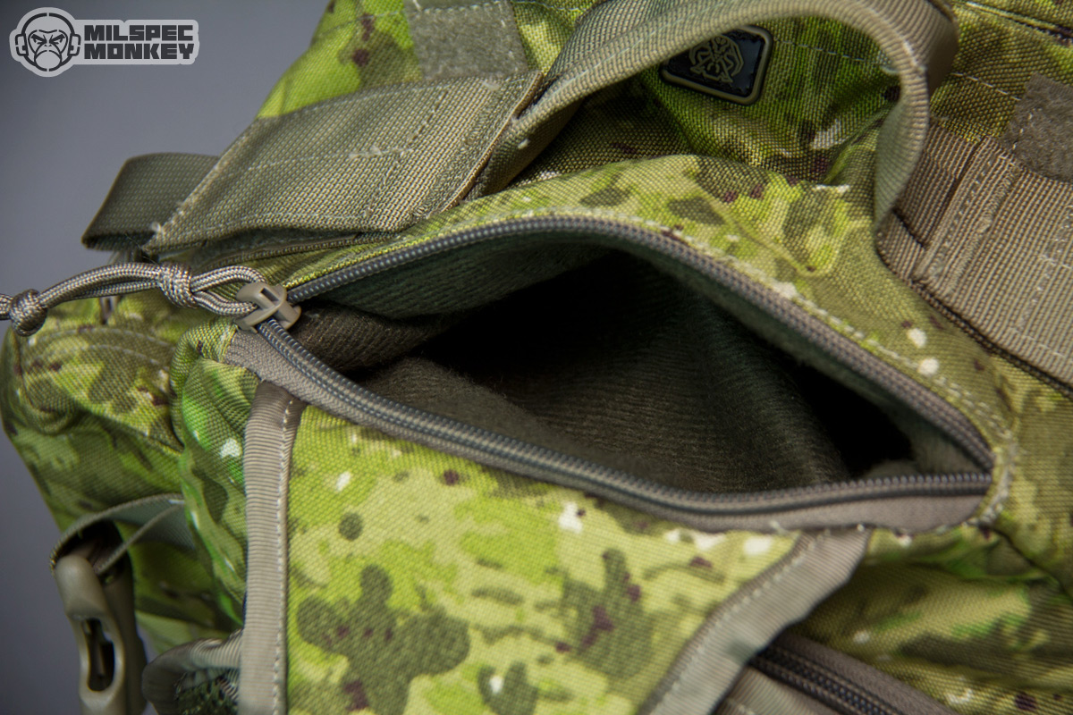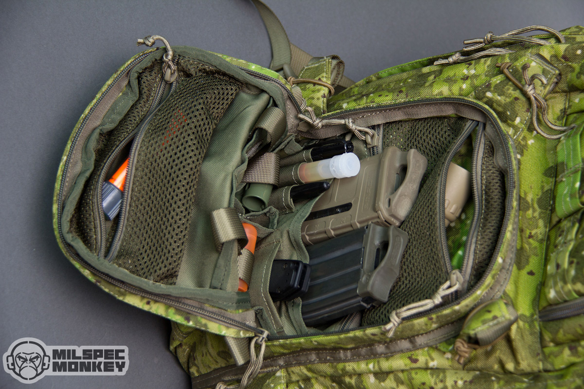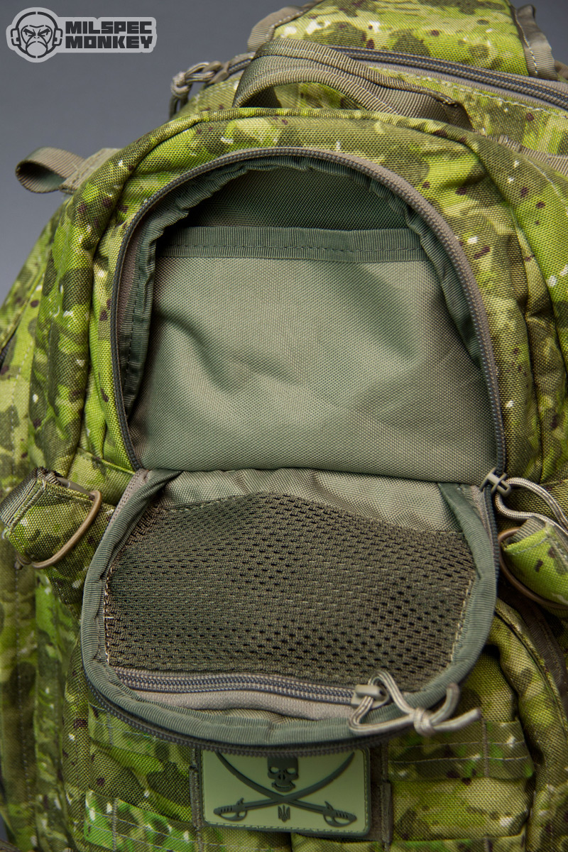 Getting to the internals, the lower front pocket opens up with dual zippers and has some substantial organizational options. The back interior has a single zippered mesh pocket, single zipper standard pocket, sleeve pocket with keyper, and 2 pockets with hook and loop straps. Snuck inside the billowed pockets are 3 pen slots on one and a simple sleeve on the other. On the frontal interior side are simlar sized pockets with hook and loop straps and a single zippered mesh pocket. Between all of theses pockets one certainly has a lot of organizational options with the sizing being pretty good for small item tactical gear variety. Moving along on compartment zones, the frontal upper one is less involved since smaller. It opens with a single zipper and has a simple sleeve on the back along with a single zipper mesh pocket on the frontal interior. The side compartments open up with single zippers and have 2 sleeve pockets. They seem like a bit of a weird size at first, but it makes more sense than one long sleeve. The side compartments offer obvious places for water bottles, but will fit a good variety of items in general.