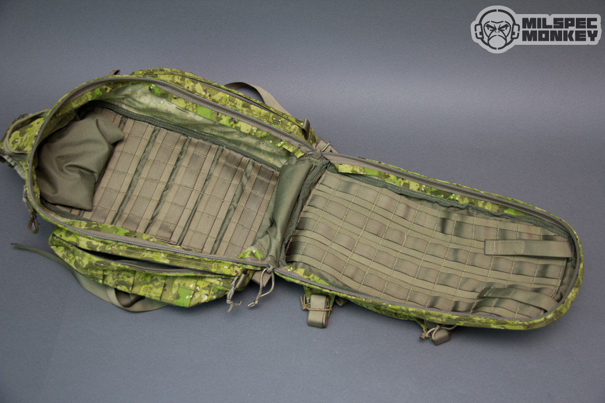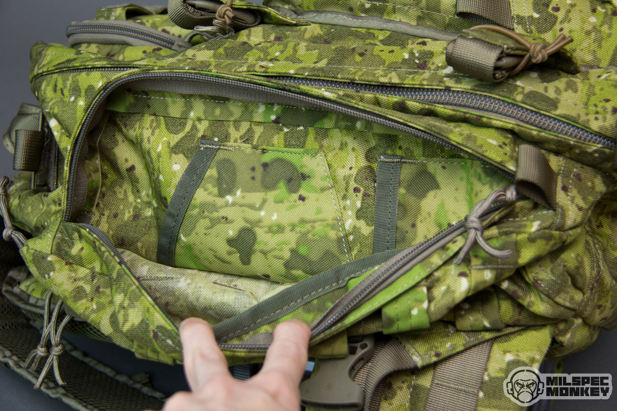 Up top is a smaller single zipper compartment. Lined with soft material it is solid place to stash eyewear or small electronics. Over in the back a good sized dual zipper opening compartment. the frontal interior has stiffener for support and there is a port hole to the main compatment on the upper back side to make it an obvious pocket option for hydration bladders. There is a hang strap, but it is a little odd being fairly long and uses a tiny bit of hook and loop closure at the end. The big show main compartment opens up with dual zippers and inside is a webbing fest. Both sides have 2" webbing with 1" webbing sewn on top, but the frontal interior side is setup for horizontal mounting and the back interior is setup for vertical mounting. The front seems close enough to PALS spec, however it is a bit odd the back side is off-spec where there is more vertical spacing. I asked P1G-TAC about it and it seemed this was due to fitting their intented SAW pouches better, but I tried to give them a fair warning most people are going to think it is pretty weird to be just a little off spec. One can still attach PALS pouches, just there will be more fudging involved and usually less weaving. I don't plan to use the 2" webbing slots anytime soon, but I could see where they may help in spacing options if lashing items directly to the webbing and perhaps make the panels a little more rigid at the same time. For a lesser seen feature there are 2 webbing straps on the upper frontal interior side to make for tear open pulls as seen on some CCW bags. Since there are 2 it allows for ambi options and the can attach to the outside using hook on the webbing and loop zones near the hydration ports.