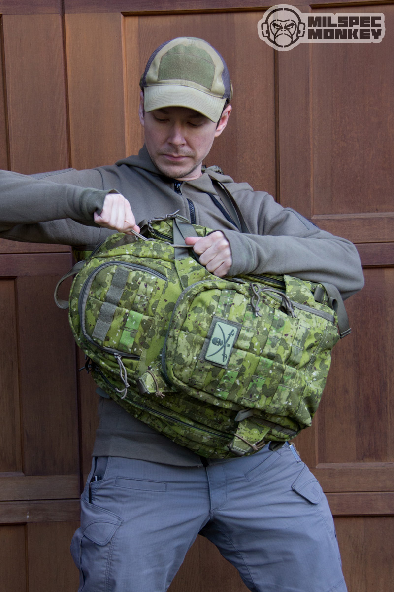 When it comes to actually wearing and using the SAW Grab Bag, the PALS interior works out overall pretty good since the horizontal mount tends to be better for accessing while slinging around to one's front and the vertical mounting works out more for using like a standard tactical backpack. From the small Monkey sized person perspective I am cutting it close on the padded belt, but generally happy I was able to cinch everything down snug. Based on the example pictures and sling bag concept I'll guess most will wear while overall slick. If wearing a battle vest the main strap will probably cover other gear and generally be a snag fest trying to rotate to one's front. When using as just a casual go bag, all the extra straps will seem like a hassle, but if one actually needs to do some serious boots on the ground action, the padded belt helps a lot with weight comfort and everything can be strapped down to allow heavy movement. As it comes closer to business time or the threat level is higher, one can then adjust the pack to be more quickly accessible. Even though the pack isn't huge, it can still hold a lot of ammo, general gear, or even some short barrel rifle setups. Small quirks aside I think the SAW Grab Bag meets it's design goals pretty well and offers some bag variety to those who may find other creative uses. At first I thought it was just heavy, over-complicated, and weird, but it grew on me after giving it a shot and thinking about what it can actually do.