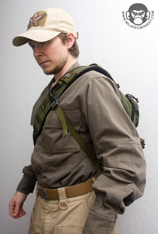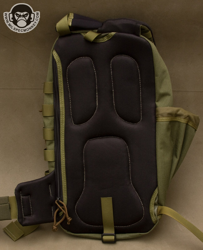 Maxpedition uses their standard Y-strap for compression, since not a large pack I'm glad to see there are no extra side compression straps. Personally I'll take the Y-strap off, but I can still see many others will find it useful. The upper front pocket needs a name as it is used on many designs these days. I'll wing it and call it the Sandwich pouch due to the many layers, and I bet that shit can hold a sandwich too! So anyway, just in case you are confused, the Sandwich pocket has a loop velcro sleeve and a shock cord rig on the outside. The idea appears to be able to lash on items externally or hold longer items like beat sticks. The zipper opening has been adjusted to be optimized for usage while the Sitka is chest mounted. Inside is the usual sleeve pocket with elastic webbing. The height is a little stubby, but the overall size of the interior of the sandwich pocket is pretty good. Moving down the exterior is a rectangle pocket. A slim zippered pocket gives quick access and has a security snap. The snap piece can be additionally used as a quick lash point. Although offset for the zipper, PALS is on the exterior for mounting options. Mounted to the exterior side is a handle which assists in both this pocket and whole pack manipulation. The double zippers to inside this pocket are also placed with chest mounted access in mind. Inside, sleeve pocket design keeps up with this concept and a key lanyard is included. For a new idea Maxpedition added a webbing and cordlock system as an anti-theft deterrent. It won't save your backpack from being stolen or anything, but it is used to lock down all of the cord pulls so gremlins will have a much harder time trying to get into any pockets. This would apply to a pick-pocket situation were the pack is still worn by the user. Back to the exterior, the left side has a generous sized water bottle pocket with cord-lock closure. The right side is more minimal with PALS to allow customization with additional pouches. Since not quite 3" wide, the PALS channels are longer than usual to allow fudging of pouches that may need 1 or 2 channels. Up top is a pretty serious pull handle making grab and go easier. The main shoulder strap is well padded like the whole back of the pack. They are pretty off-spec, but a variety of PALS-like webbing is on the shoulder strap exterior to all general mounting. A HK hook is mounted as an attachment bonus. If one needs to get into heavier movement, a cross strap is available and I like how a tuck-hole was integrated into the bottom back for storage when not in use. Incorporated into the back is a large pocket good for holding hydration bladders or concealed weapons thanks to the loop velcro panel inside. Older pack designs required one to take off their pack to access this pocket, but when chest mounted, opening the zipper is not bad at all on the Sitka.