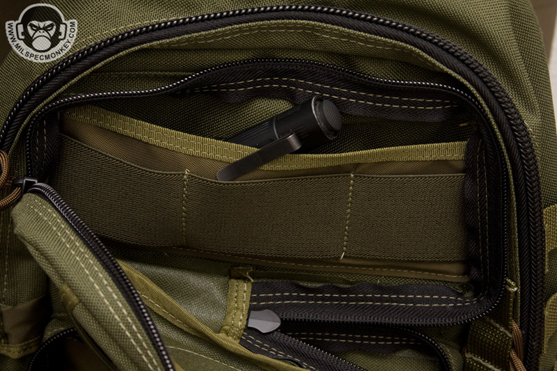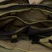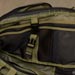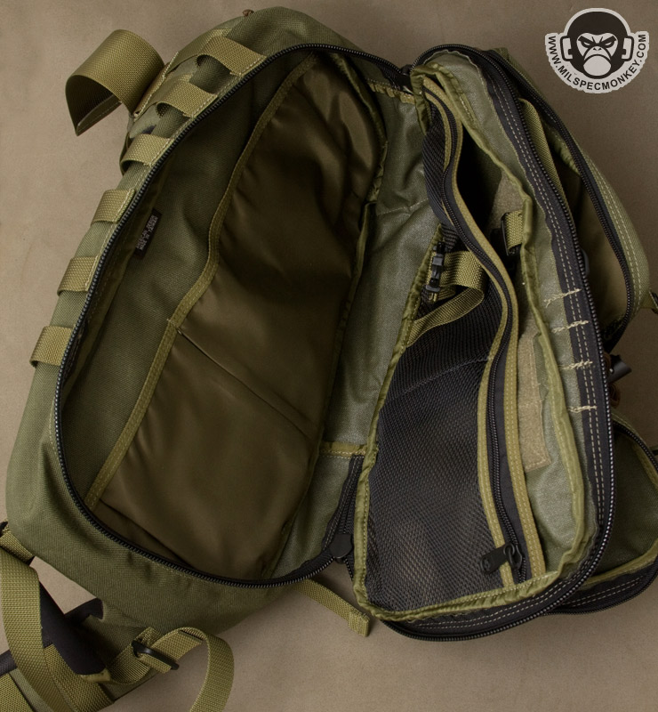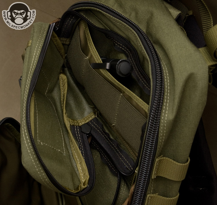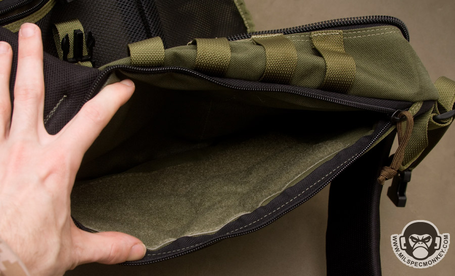 Keeping with the chest access theme, the zipper placement to the main interior is done appropriately. It isn't quite clamshell as that would be floppy, but still a good sized opening. The interior back has simple sleeve pockets divided into one fairly large and one small pocket. The tension of the fabric here makes the pocket useful for both slim and medium thickness items. On the other side, the interior front, a lot is going on starting with a zippered mesh sleeve pocket. It is divided similar to the other side creating large and small pocket areas. Behind this is a large sleeve pocket with a good sized loop velcro panel. This has good potential for CCW or other velcro add-ons. An SRB strap is incorporated to assist in compressing the whole interior front if desired.