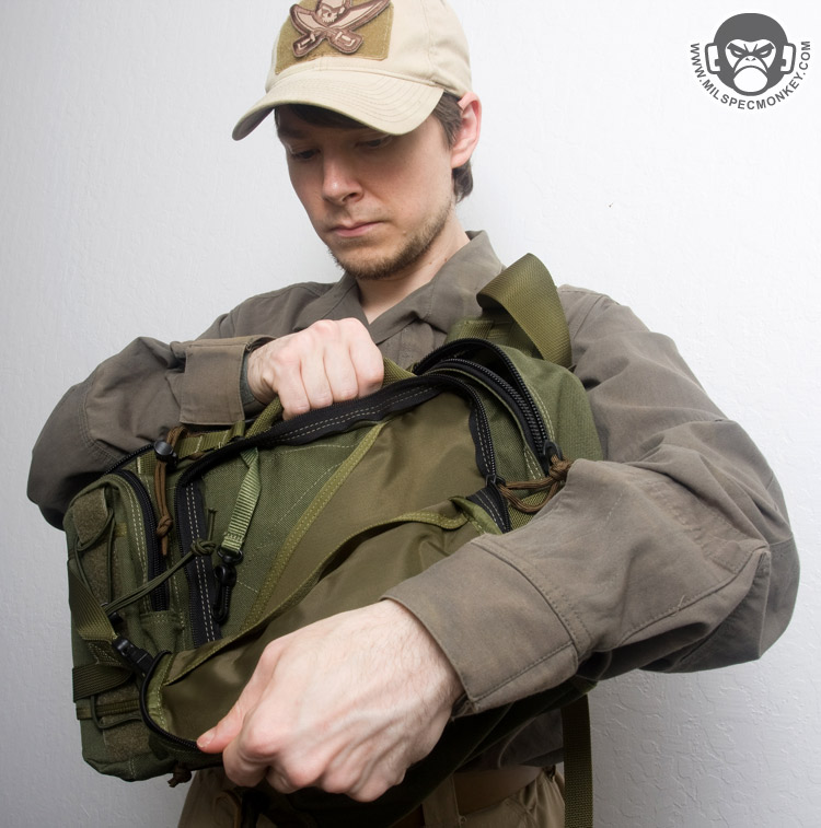 Maxpedition keeps em coming with further development in the popular gearslinger series. The Sitka first comes off to me as an evolution of mixing Typhoon and Lunada concepts. The result is a single strap smaller sized backpack that can be easily accessed when shifted from back to frontal position. Features are certainly abundant so I'll try not to bore you out going overkill with detail.