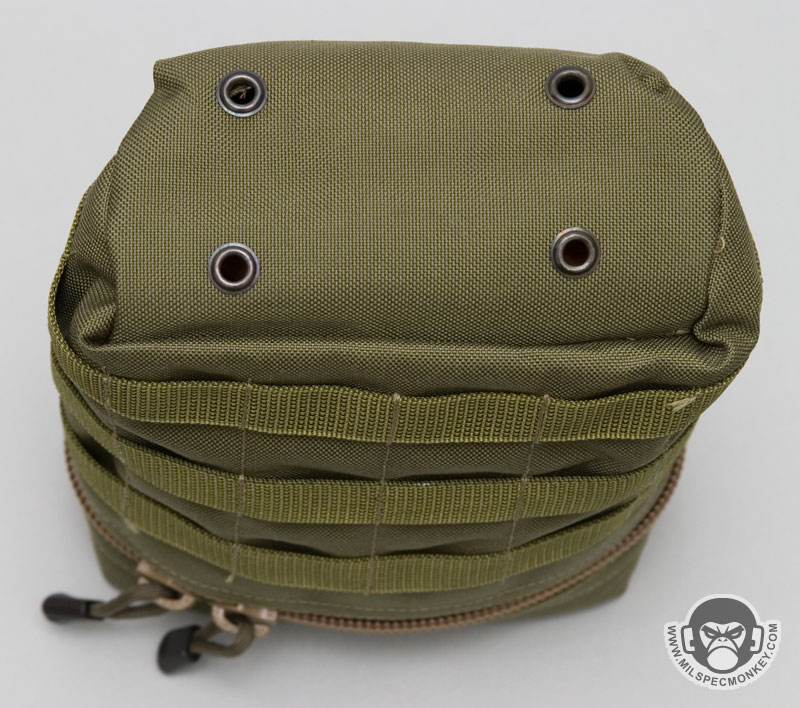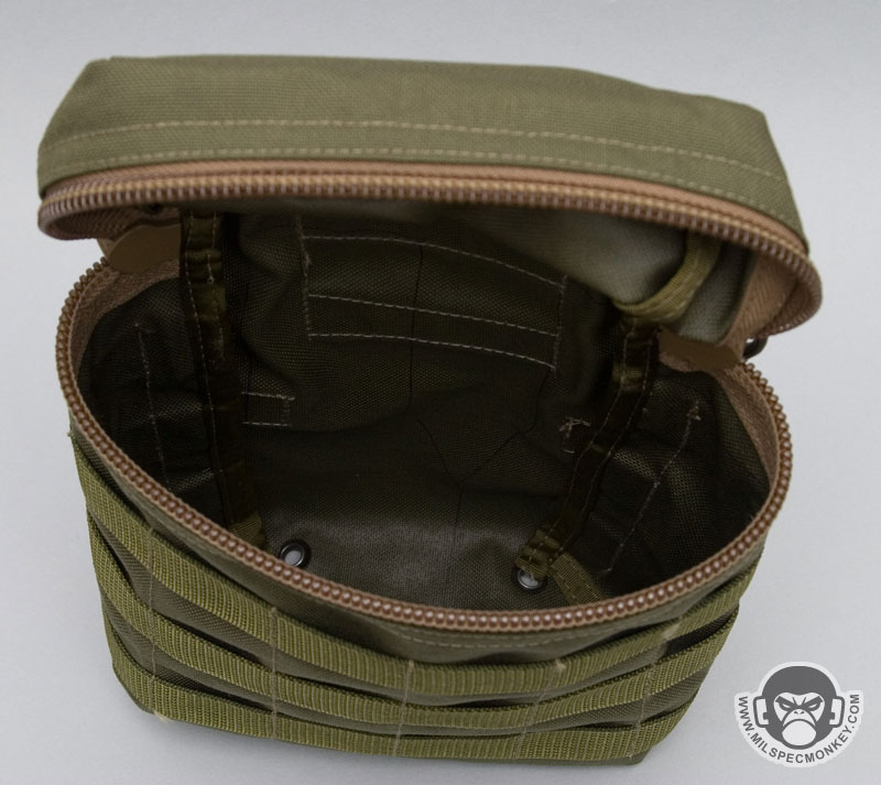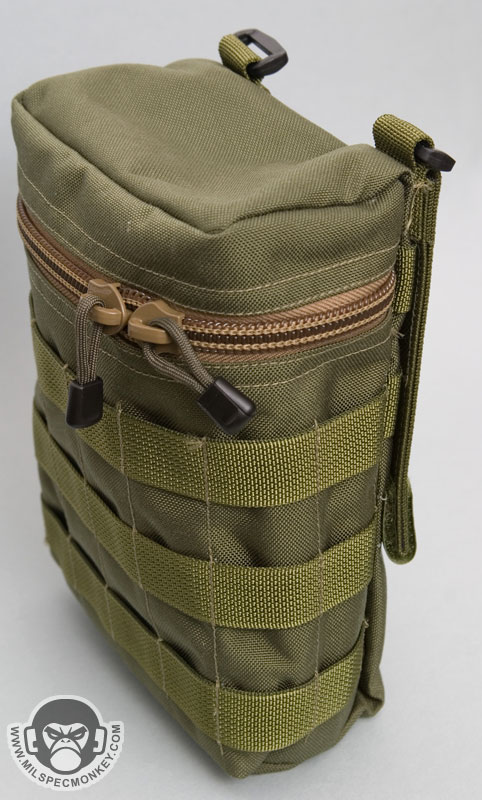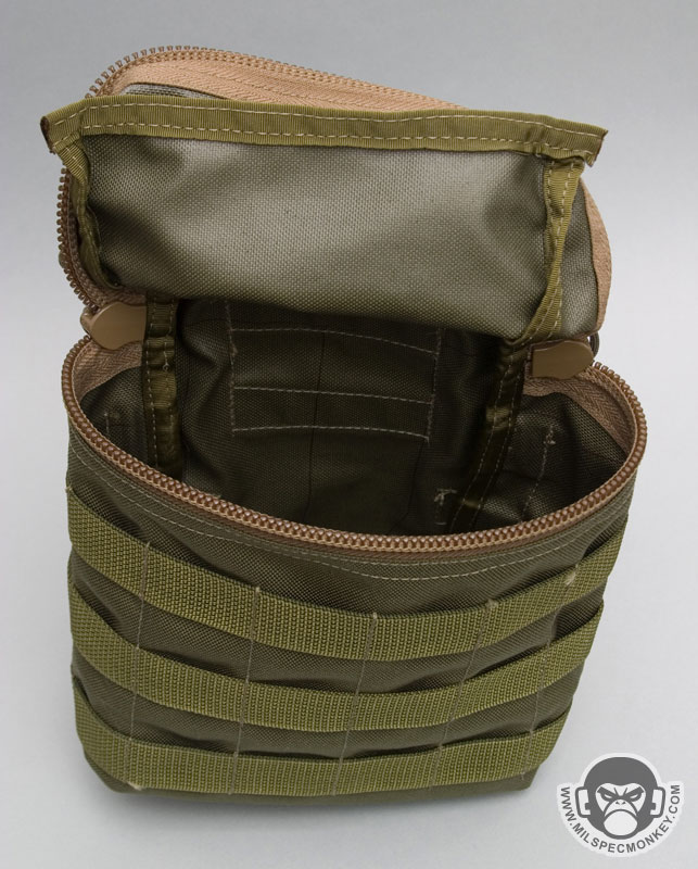 Although originally designed to hold a complete ADF issue ration pack, I find this to be a great general purpose pouch. After seeing the design I'm actually surprised I don't see more like it. The front zip makes this pouch a lot easier to operate when mounted to one's side, which is usually where GP pouches end up. When on the side, the horizontal zipper movement is much more natural than the common top open GP pouches. This design also has more of a rounded rectangle shape with a healthy dose of exterior PALS real estate. The inside is straight forward, with no loops or elastic. Extra plastic slides have been added to the upper back exterior to allow further mounting options.