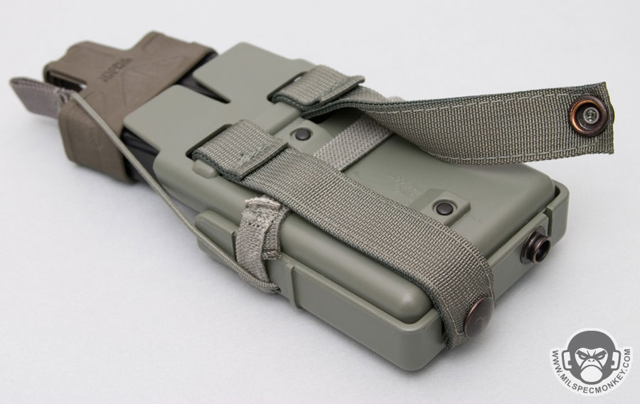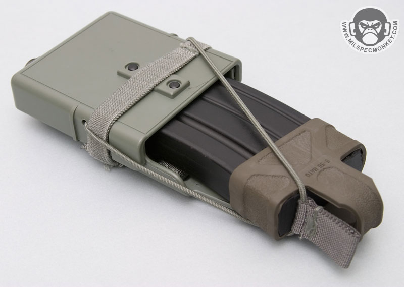 Now the thing that makes the FASTMAG cool to me it that it can be mounted upside-down. The grip is strong enough where one can do plenty of vigorous activities without the magazine inside shifting or falling out. For those who like a little backup or are doing airborne operations, a shock-cord and pull tab "jump" strap is included to further make sure your mag doesn't go anywhere. When the strap is not in use, the back- bottom of the FASTMAG seems to be the optimal place to store it.
