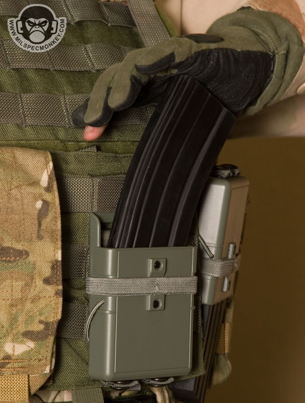 This interesting take on a no flap mag pouch was designed by DownEast Inc. and is being distributed by ITW Military Products. The main idea is to hold 1, 30 round NATO magazine securely with no flaps or straps. The core design is 2 pieces of high-impact resistant polymer that are snapped together at the bottom.