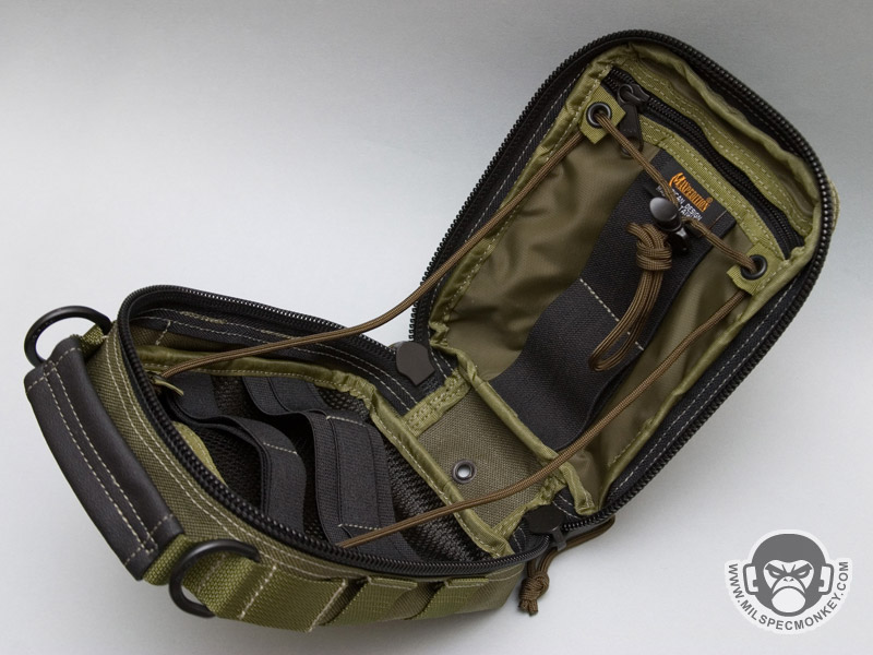 A beefy handle is on top so one can put it in a larger bag, but rip out to deploy easily. D-rings on the upper sides allow extra connection possibilities and the clam shell opening design lets one open up the pouch to get to business quickly. Connection points and a 550 cord/cord lock rig allow the user to set the opening angle which is helpful when mounted to kit. If you are not into that it can easily be removed and replaced later if desired. The inside includes well placed large elastic loops to hold your goods and a mesh sleeve on one side with a zippered pocket on the other for even more options. Moving back to the exterior, the PALS webbing on the front and back are wide non-spec to allow an easier time of sliding in common tools such as medical shears. The front also has a shockcord rig for holding extra items which is ontop of a horizontal sleeve "cave" for holding tools such as flashlights. This area also has velcro for your ID patches. As a nice touch the sides have webbing for further connection / holder points. Currently available in Black, Green, Khaki, and ACU.