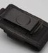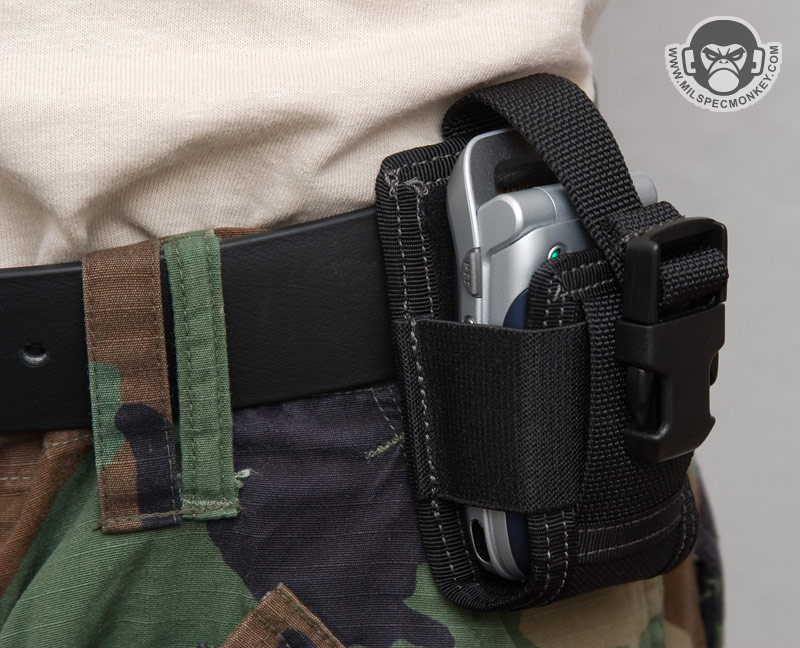 The inside is lined with soft goodness to play nice with your phone and won't scratch it up. The elastic sides work well for adjustability and hold, but also don't smash in buttons on the sides of most phones. The female part of the SRB is mounted directly on the holster so you only have to worry about the male strap when connecting and releasing. I wish there was a clever way to get the holder strap out of the way when releasing one's phone, but I find knocking it away to the side is not too bad. The holster comes with a beefy heavy duty spring steel clip that has a jet black power coat and can accommodate up to 2.25" belt loop. This clip has a great grip, but if you would like different mounting options, you can easily take it off and use the PALS webbing. A short Malice clip (sold separately) fits in there nicely or if you want to get a little wacky, one could thread a thin belt through there for a horizontal holster mount. Currently only available in Black and pictures show a Sony Z525a phone as a demo piece.