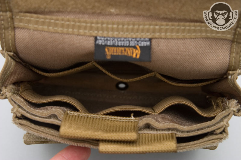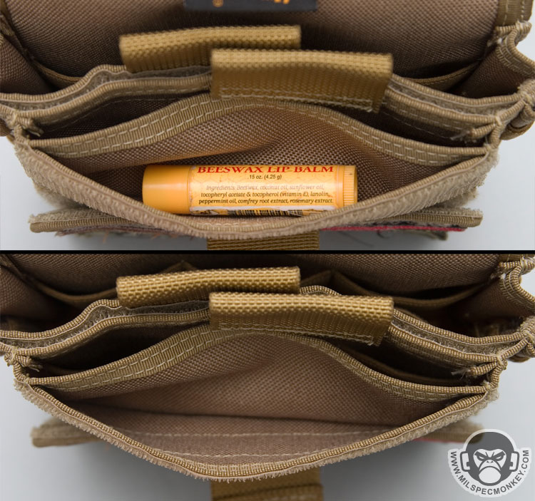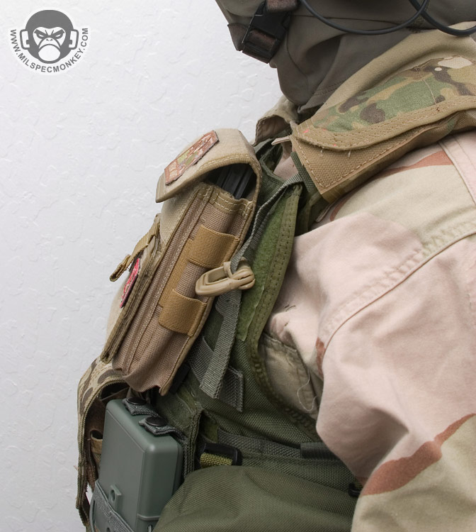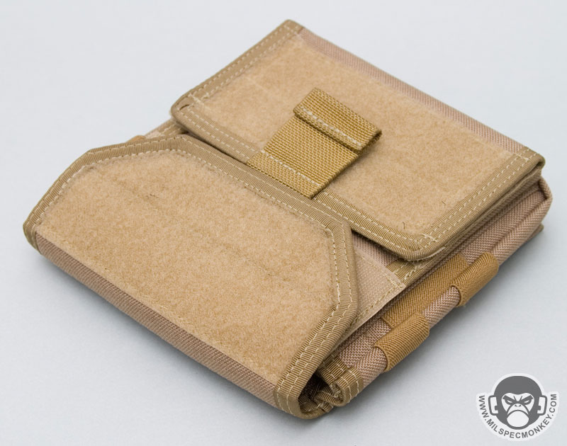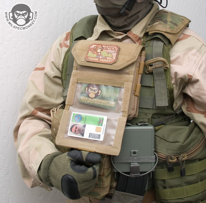 Another feature setting the Monkey Combat Pouch apart from the rest is the unique ID flap. Although at first glance, one may want to pull up on the pull tab, the tab is pulled down to open. A clear vinyl sleeve with anti-glare texture allows placement for 2 IDs, a mini map, ballistic sheet, HVT pictures, or whatever slim item one wants to put in there. The folding of the pocket naturally makes 2 divisions, but there is only one opening to deal with. When the flap is closed, the goods are velcro sealed securely inside. This allows the user to quickly flash their ID or view intel when needed, then go back to business being fully concealed. The way the ID flap is stitched to the pouch creates a cave area where items can be stored. A flashlight, beatstick, or knife fit in here well for quick access, but low security. Alternatively slim paper documents can be hidden inside as well.