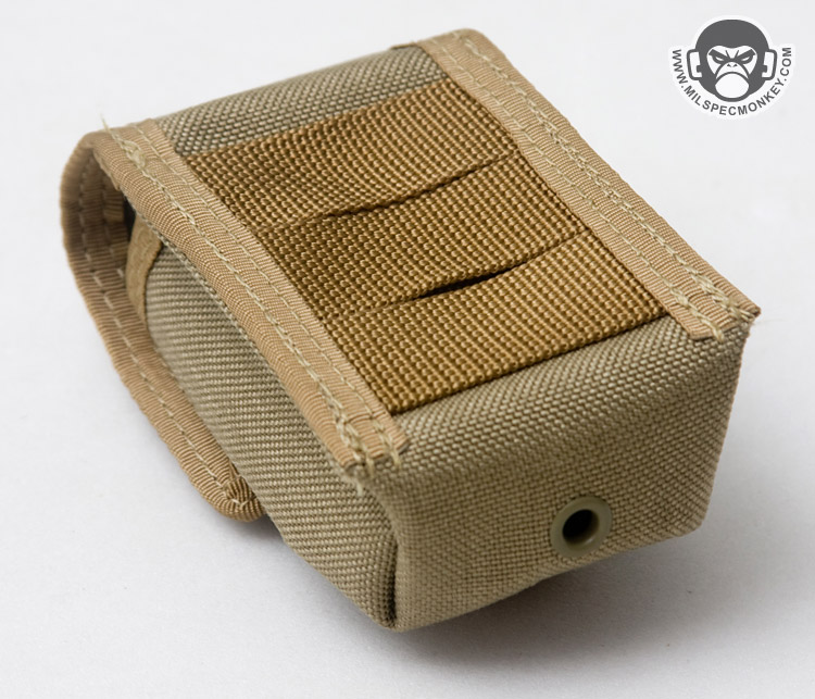 The opening is a velcro based flap with an additional SRB buckle which made seem needless offhand, but does give the option for silent functionality. As shown in the last pic, the flap can be folded over where additional loop velcro will keep it in place. This makes flap management easier for entering silent configuration and general usage. Inside are 2 cord loops for nice attachment points to lash your gear item to. I don't have every item on the fit list, so I have a little concern some items may be a little loose since the SRB is non-adjustable. The back has PALS webbing to use a 3" Tac Tie or similar item to attach onto your gear.