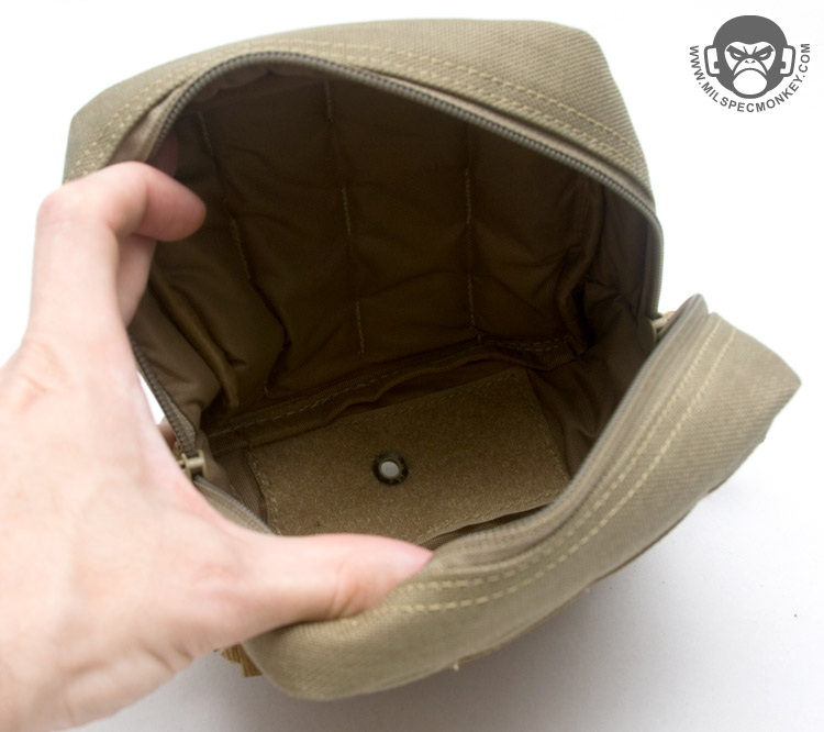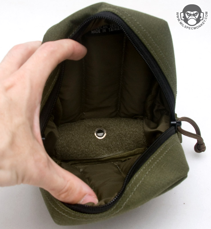 I'm not sure of the design intent, but there is loop velcro in the interior bottom of each pouch. The front has 3 channels of PALS (5" tall) With a good dose of loop velcro for your favorite patch. The logo is even off the velcro area as to not steal your space which has been a problem on some other designs. The backs have a full set of PALS for the most mounting options. 5" Tac Ties or similar are recommended for mounting. For when things get wet and wild a grommet is on the bottom for drainage. Check these out for padded pouches with more features than most.