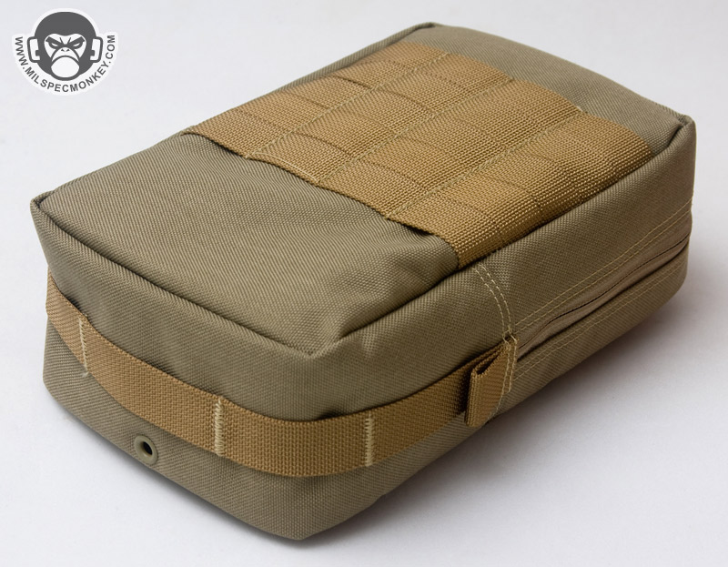 They go down about two thirds the way to create a good sized opening and webbing tabs are also on the end for zipper pull points or attach points. The webbing for these tabs travels along the bottom with an offset drainage gromet to allow extra lashing options. I'm not sure of the design intent, but there is loop velcro in the interior bottom of each pouch. The front has 5 channels of PALS (9" tall) With a good dose of loop velcro for your favorite patch. The back has a full set of PALS for the most mounting options. 5" Tac Ties or similar are recommended for mounting. Since it is a tall pouch, they hang down from the attachment point, however this adds some flexibility when mounted to a body. There aren't a lot of MIL padded pouches these days so this 6x9 one makes for a solid option.