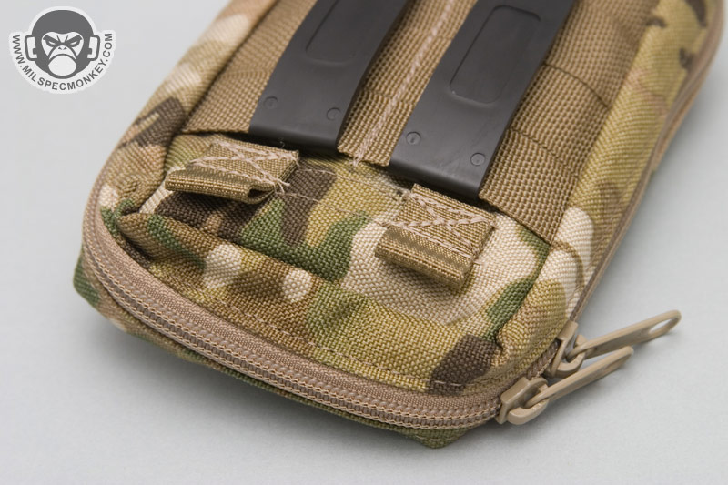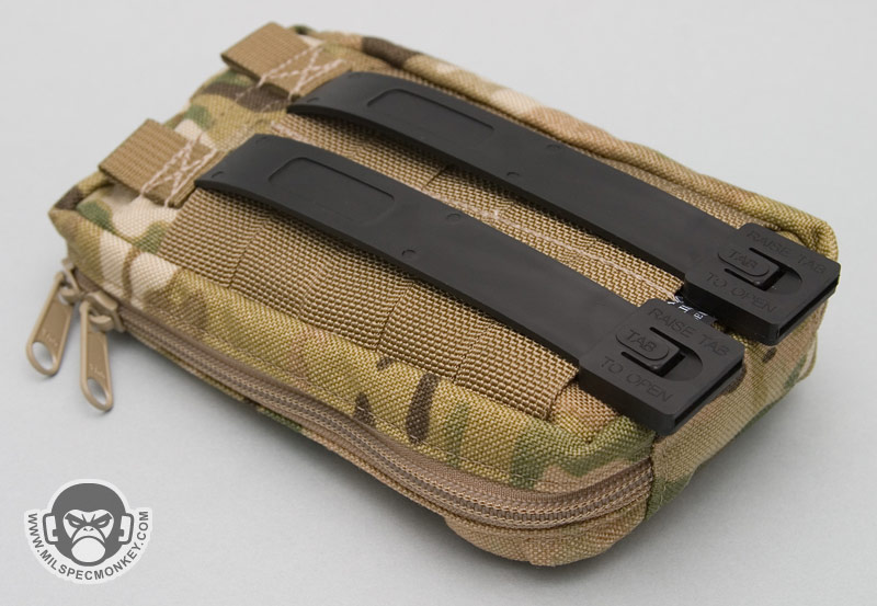 An example loadout could include: chem lights in the loops, signal mirrors, map in the clear window, Blood Chit, radio frequencies, or rifle dope. Civie wise this pouch can be horizontally belt mounted and make a pretty good organizer. One could keep all their wallet type items, pens, notes, and more. The back has larger than usual PALS columns to allow placement fudging between 2 or 3 columns wide using 2 long Malice Clips. Up top are 2 webbing loops for further mounting options. No cons offhand, everything is functional and the size / layout bring something new to the pouch market. This particular one is vertical mount, but a horizontal version is also available. Word on the street is the horizontal version can make a pretty nice admin pouch as well. Currently available in OD, Tan, ACU, and Multicam.