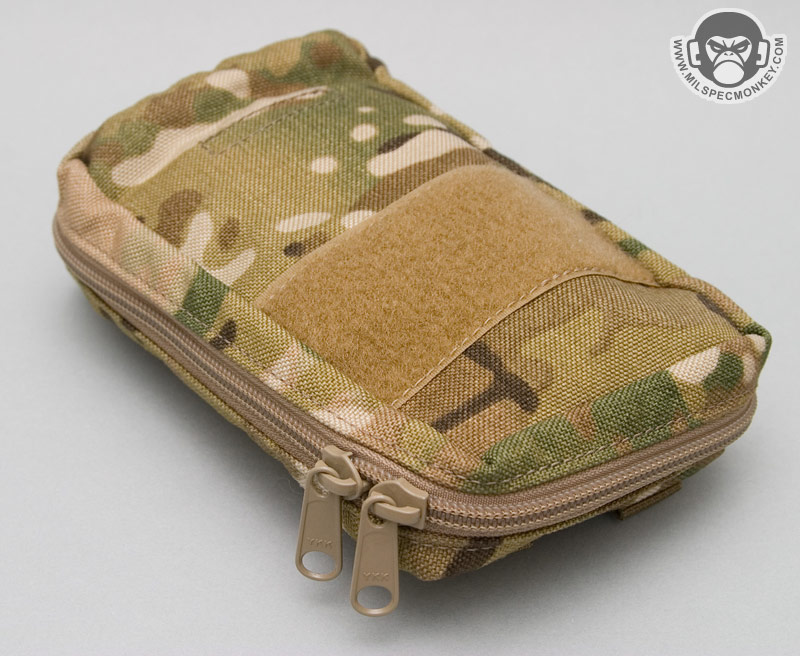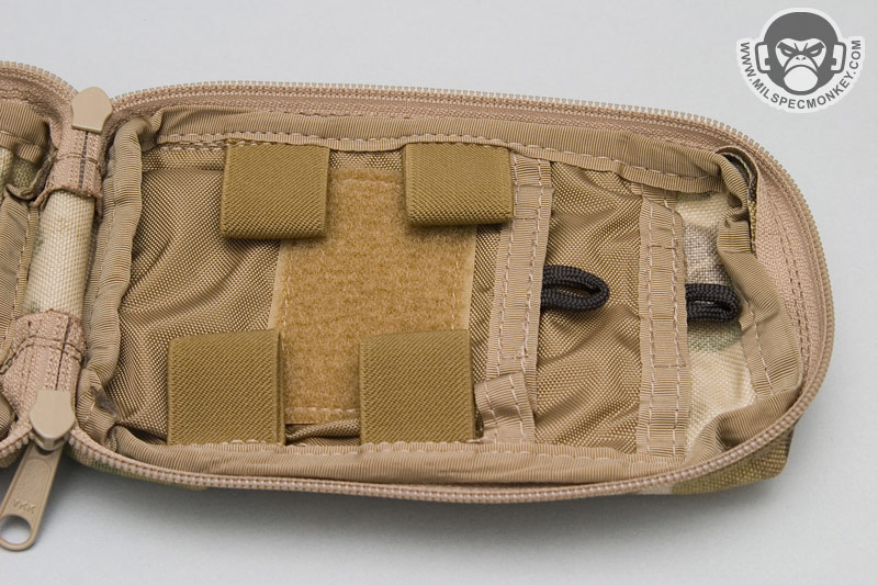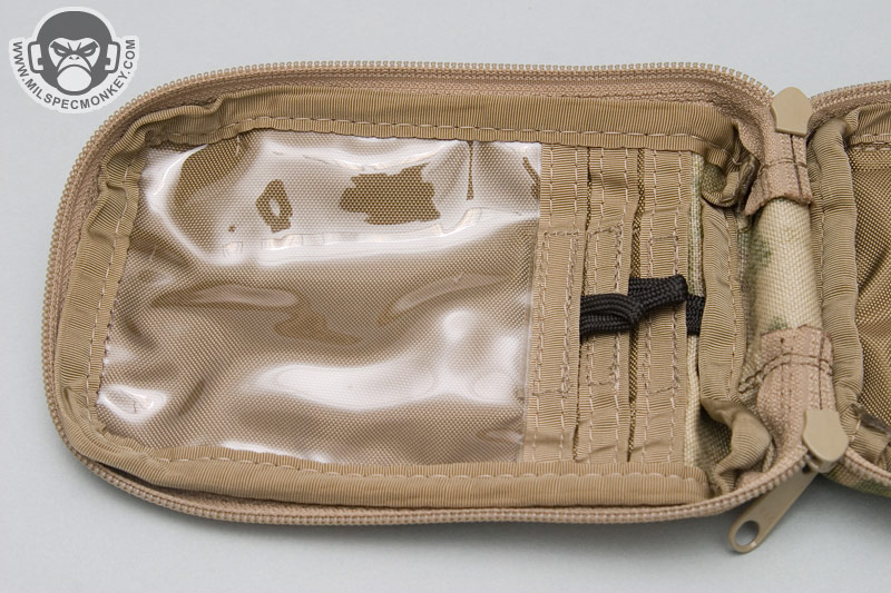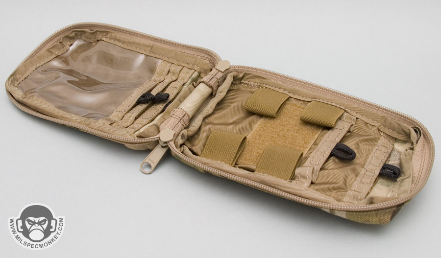 This pouch is intended to hold all the smaller survival gear one might need in an escape and evade situation. The exterior strip has a strip of loop velcro for ID / patches and the main functionality is a double zipper clam shell opening. Inside reveals many velcro sealed sleeves to include 5 internal pockets, clear window on main pocket, 4 elastic loops and a small velcro panel. Little 550 cord loops are added to the velcro seals to assist in opening.