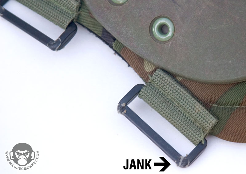 Simple and Affordable classic knee pads. Overall offer good protection and cushioning with nice flexibility. Since I'm <monkey> sized I can't tighten these as much as I would like and rely on the specwargear pants with knee pad retention system. Otherwise these guys go straight to my ankles after a sprint. Earlier I tried attaching surgical tubing from my belt to the pad strap which apparently caused a lot of stress on the pads breaking one buckle and starting to rip one of the sew points as shown in the pics.