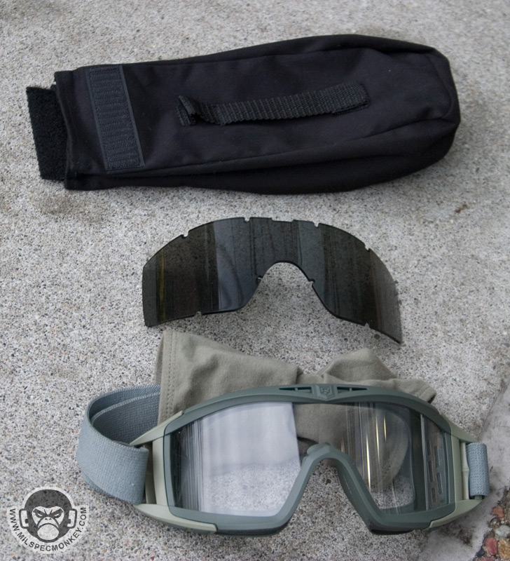 Revision hooked me up with a pair of these goggles at shotshow. I haven't made it to a base trip yet, but I have been wearing them off and on and I did send a coworker with them to a SFAUC trip. He was quite happy with them and did not fog despite near freezing weather. My impressions so far: These are a great size delivering protection with as much field of view possible. Kit comes with carry bag that has a pocket for a spare lens, in this case the tinted one and a cover sock was also included. The Desert Locust is one of the easiest goggles to change lenses out of.