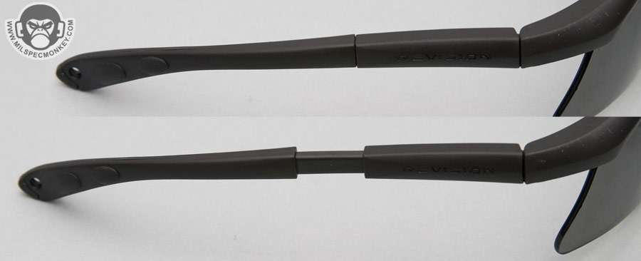 When I first put them on I thought I was going to go crazy from temple pressure, but soon found I could easily adjust the arms for a comfy fit. Even then there are 2 frame sizes of regular and large. The tips have rubber to help stay on your head and on optional strap comes with the kit which snaps onto the arm ends. The Sawflys already stay on one's head pretty well, but it is nice to have the strap if you plan on some vigorous activities. Changing frames is easier than expected in which one places them in the frame slot and "rocks" them in or out of place. It is nice that the nose pieces come with each lens and can be interchanged. The nose pieces also connect with Revision's prescription inserts like most of their products. Peripheral vision is overall great. While looking directly forward, I just see hints of the frames in the top of my view. Since an open lens design, the fog resistance is overall great as well, but I was able to fog them up during sports activities. They did however, unfog on their own with less activity rather than requiring a full wipe down. As you may have guessed, each lens type did its job well. The dark lens made for good sunglasses, yellow enhanced cloudy or dim light situations, and clear was good for unmodified vision. Although new, apparently tan frames are now available which have slightly different rubberized arm ends. Check out the revision site for all the detailed technical specs: