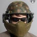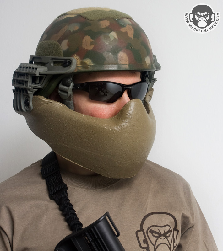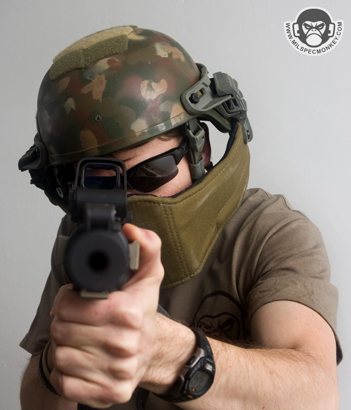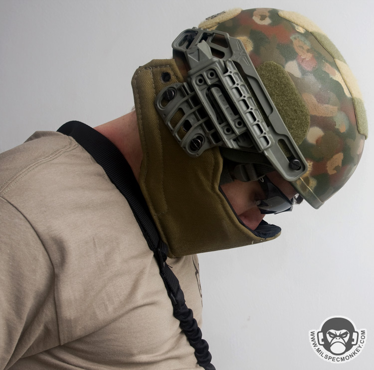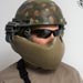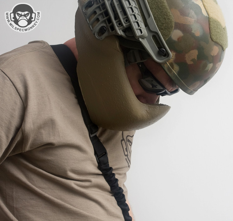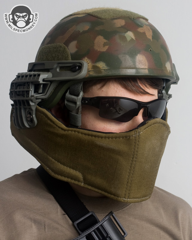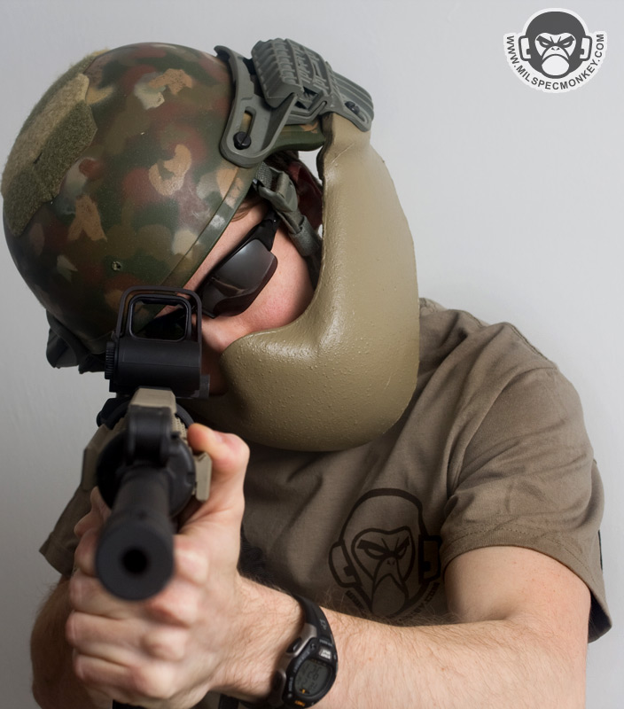 The G3A was their first design with the intent to mostly be used with crew served weaponry. A perfect example would be a turret gunner on a hummer, but this can apply to many similar situations. Since weapon cheekweld is less of a concern, the armor is hard to offer the highest balance of weight and protection. For not being some wacky metal or ceramic it is surprisingly capable of absorbing an AK 7.62x39 round without penetration. Even if not getting shot at much, the G3A makes great sense for additional IED protection. A lot of other design balance has been put into how much of the face is covered and how far away it extends. This combination gives almost no obstruction of vision while creating a gap for breathability and space for communications gear. The vast majority of glasses and goggles can still be used and thus night vision compatibility stays in tact as well. Despite the armor extention away from the face, the operator is still able to look down and have reasonable head movement even with soft neck armor on.