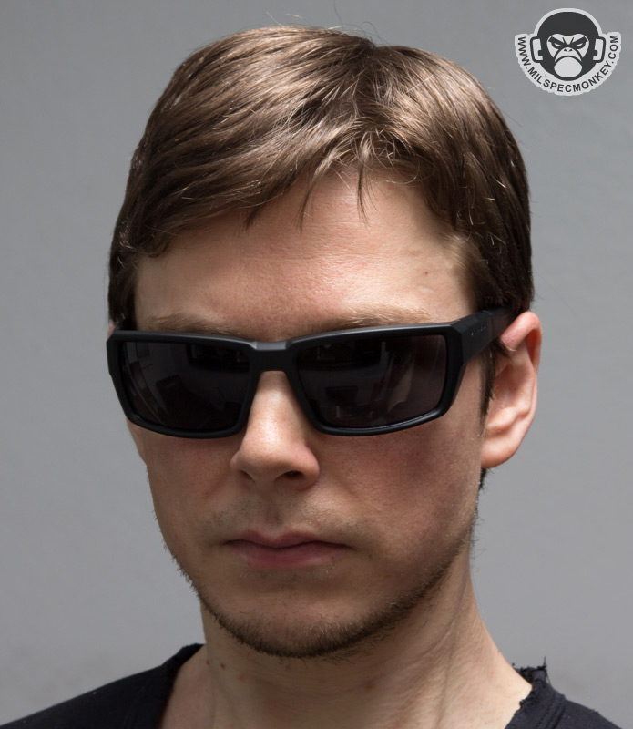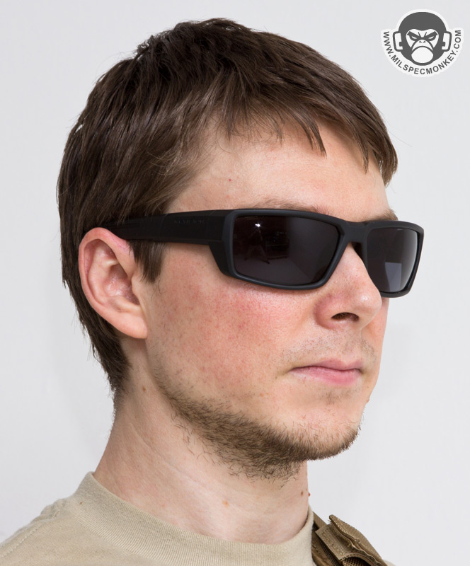 Overall the frame is simple and boxy with subtle angles to add a dash of aggressiveness to the look. The lenses offer solid visibility, not as much peripheral as say the Sawfly glasses, however I've never felt vision hindered while wearing the Vipertail. One of the big pluses of course is the ballistic protection the Vipertail offer; exceeding ANSI Z87.1-2010 and U.S. military standard MIL-PRF-31013. Thus they offer more than enough protection for usage while handling firearms and other tactical applications. The arms are simplistic with no size adjustment. As you might think since they look like daggers, the arms slide in quite easy while wearing a hat or hearing protection. Since the arms don't end in a curve or have a sport strap connection point, the Vipertails are more prone to sliding down one's face during heavy movement. I am also on the smaller end of human sizes so this issue will likely be less for normal and large sized folks. Some interesting knubs are on the nose pad area, they actually end up more comfortable than it looks. It seems to find a good balance of grip and comfort even while all sweaty.