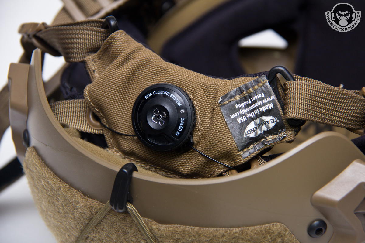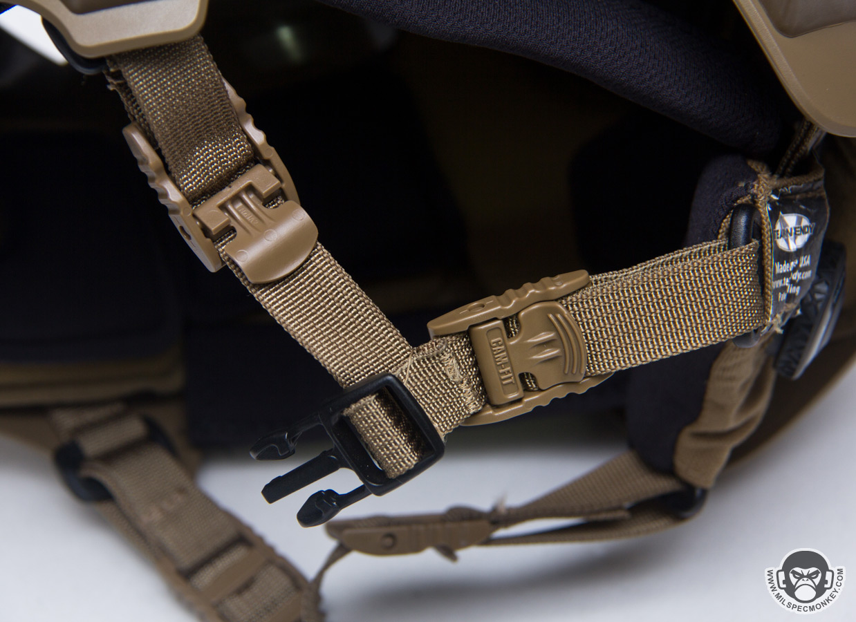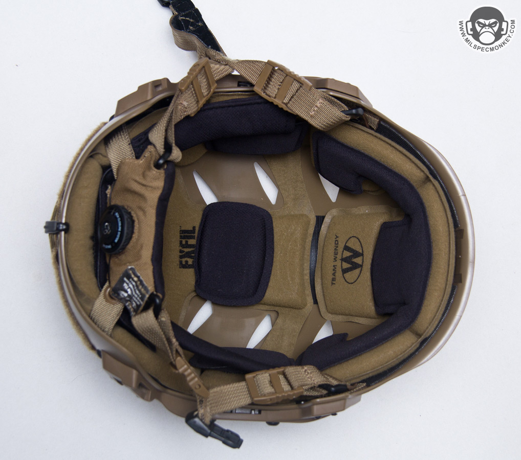 Moving to the interior, things could be summed up as fancy. Although based on the common velcro attachment pad system, EXFIL has it's own special core pad setup (Zorbium foam liner), and then extra pads are included to mount on top and allow further comfort customization. Being used to ballistic helmets where the pads have more depth and give, I thought the EXFIL pads were a bit stiff at first, but it didn't take long to get used to with the less weight and all. The EXFIL also goes big with the chin strap/harness using Team Wendy's Cam Fit system. Most of it looks as expected for the chin strap with nice custom cam buckle hardware, but in the back is a BOA closure system to help adjust wrap on the sides of the head. The end result allows a nice fit that wraps around more of the head rather than just 4 key points. Since I'm a small dude, I'm at the bottom of their Medium helmet size range with a head circumference of about 55cm tight. As a result I found I was maxing out the lower/back straps adjustment and went ahead and modified them so I could tighten further. The default maximum strap amount seems way rowdy to me and still they offer a chinstrap extender accessory.