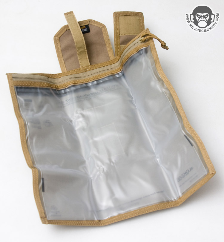 Starting with the exterior there is elastic webbing on both frontal sides and on the bottom. The sides work great for chem lights and pens while the bottom can accommodate thicker items such as medical gear or folding knives. With a little elbow greese you can even get a full size CAT tourniquet in there on the bottom.